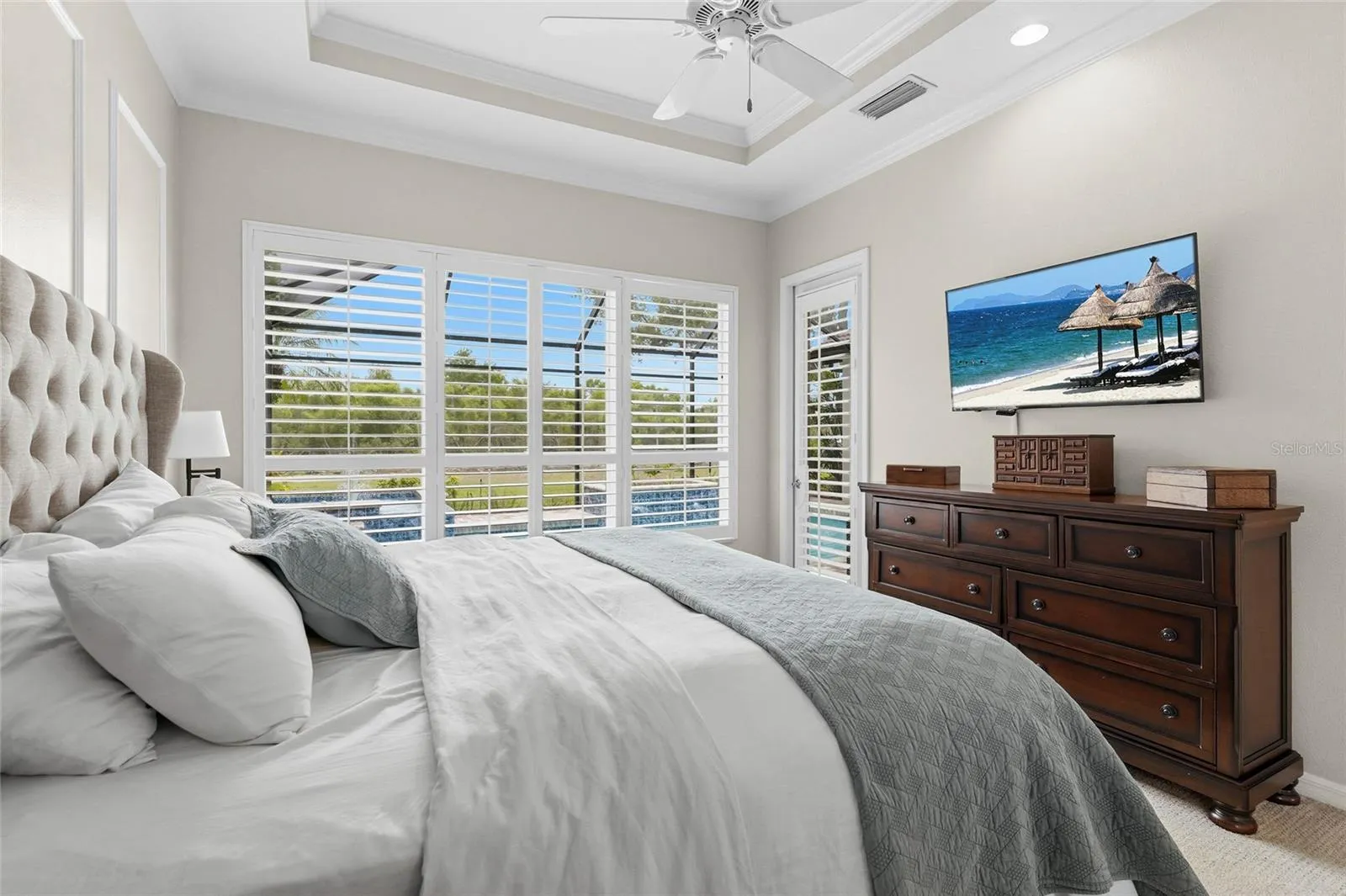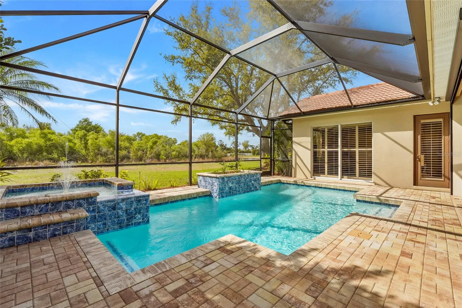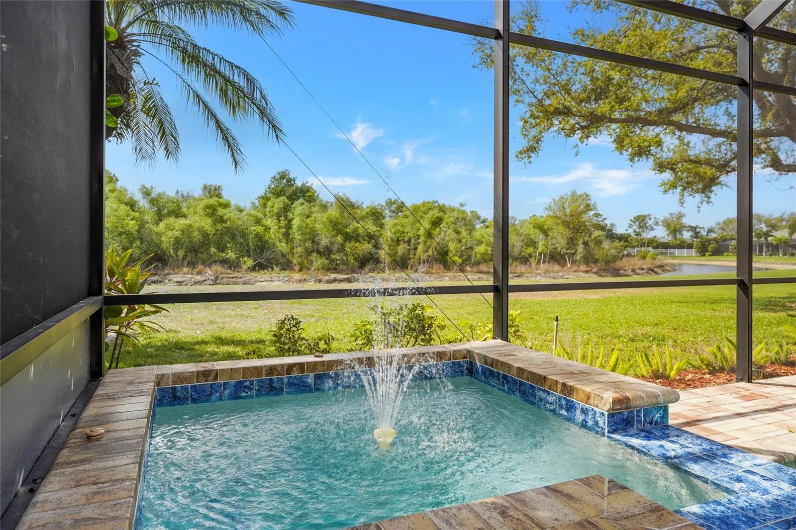 The screened in pool and spa overlook a wide green space and tranquil pond, creating a private and picturesque setting for relaxing or entertaining. Enjoy peaceful mornings with coffee by the water, afternoons spent poolside, or evenings unwinding in the spa while watching the sunset.