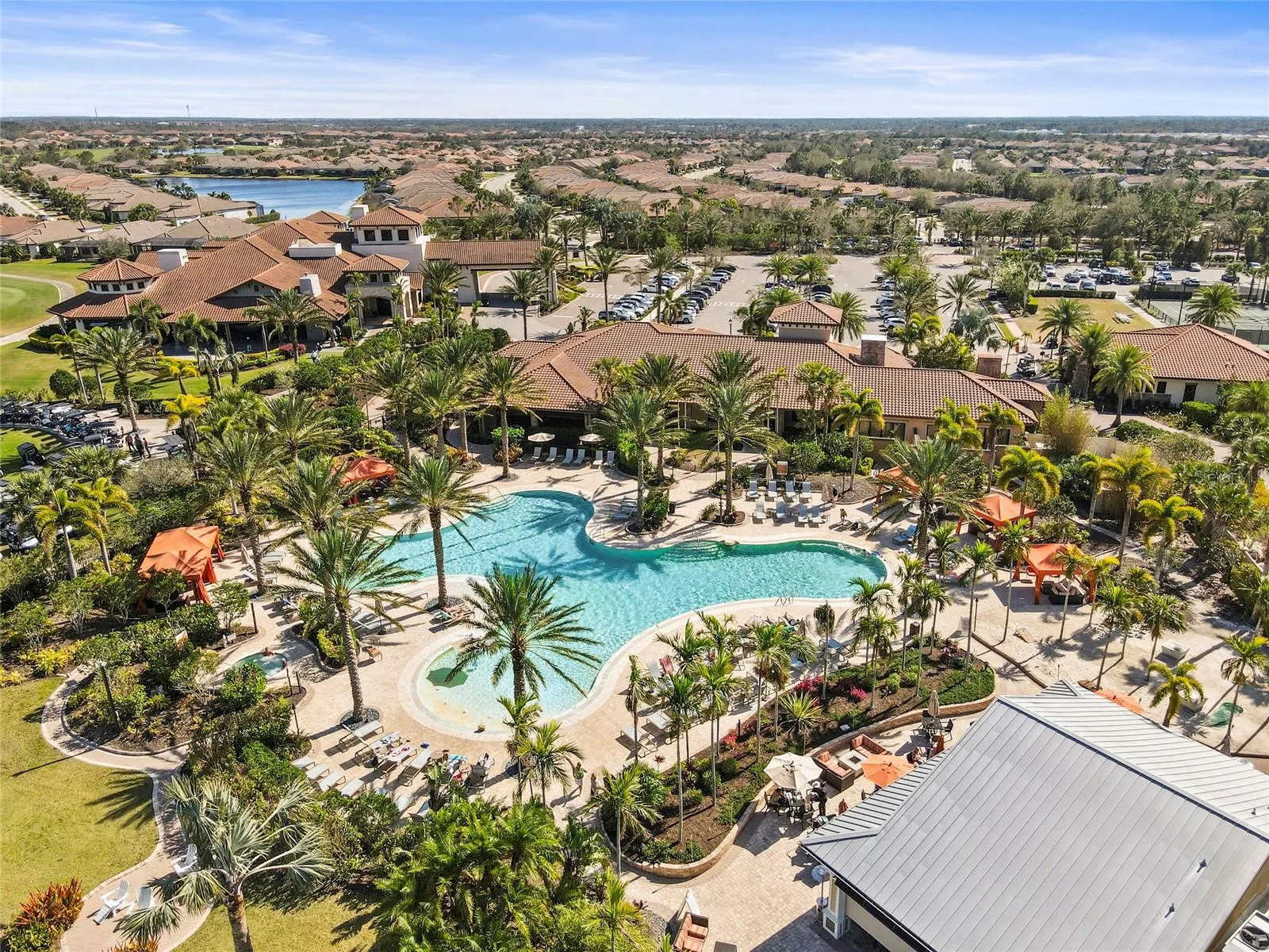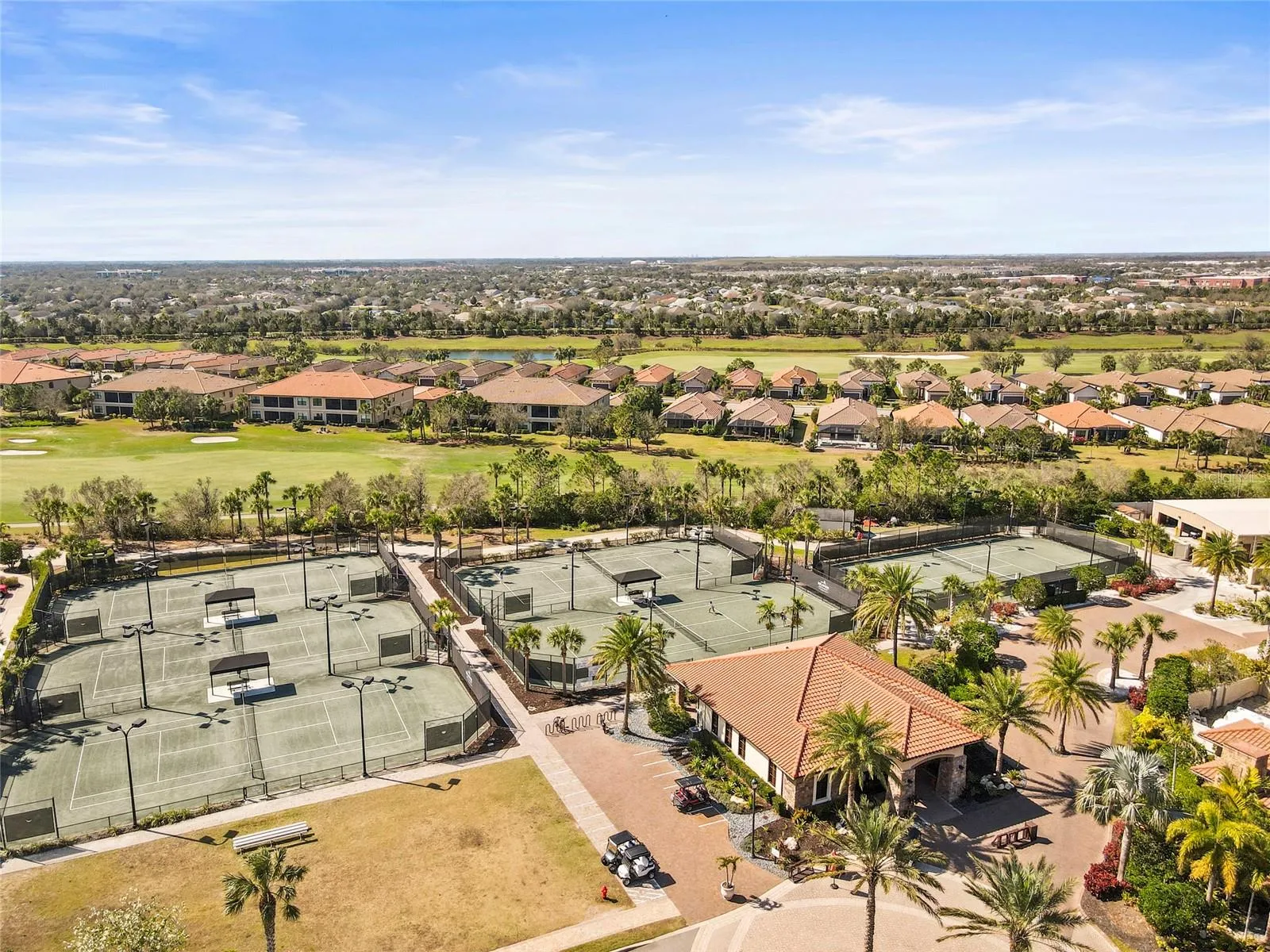 Tennis, pickleball, and bocce courts, Three resort pools, two hot tubs, and a resistance pool, Two fitness centers with classes