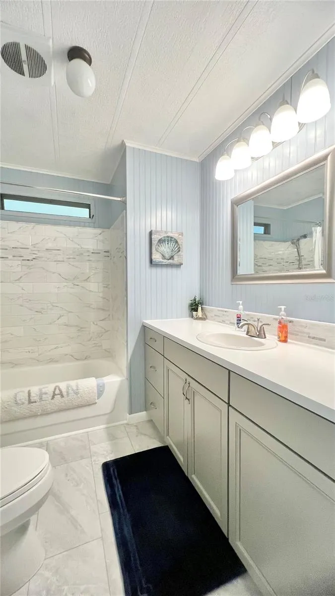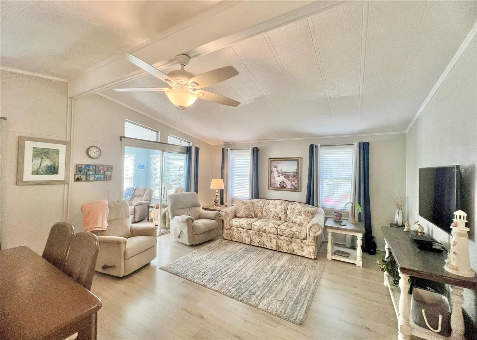 This stunning, partically furnished residence offers an inviting open layout connecting the living room, dining area, and kitchen under soaring cathedral ceilings. Freshly painted throughout, the home is bright, cheerful, and move-in ready. Newer luxury vinyl plank flooring adds a touch of modern elegance in every room except the bathrooms and the light-filled Florida Room, which features its own cathedral ceiling and provides a serene space to unwind. While not included in the official square footage, this Florida Room adds 200 sq ft of valuable bonus living space. Thoughtful updates throughout the home enhance both comfort and style. Both entry doors have been replaced and have built-in blinds between the glass for added privacy and ease. The spacious primary bedroom includes a walk-in closet and a private en suite with a walk-in shower. The beautifully remodeled main bathroom showcases a new tub with ceramic tile surround, updated beadboard, new flooring, and a stylish vanity that adds to the home’s charm. Enjoy your morning coffee or evening read in the private screened room behind the shed—a peaceful retreat all your own. Practical upgrades include a new vapor barrier installed in 2022, a newer A/C unit (2018), and a roof-over with double-pane replacement windows, enhancing the home’s quiet, energy-efficient appeal. Fairway Village is not just a place to live—it’s a lifestyle. Residents can enjoy access to the private 9-hole, par-3 golf course with two lakefront fairways and a putting green, a scenic 5-acre lake for catch-and-release fishing, two pools and hot tubs, and eight covered shuffleboard courts. The newly opened 19,000+ sq. ft. clubhouse (opened January 2022) offers a 700-seat auditorium and ballroom, a commercial kitchen, performance stage, fitness center, library, card and billiard rooms, cozy lounges, and free community-wide Wi-Fi. With a full calendar of over 50 social events each year, it’s easy to feel connected and part of something special. The 2025 monthly maintenance fee of $420.00 includes water, sewer, high-speed internet, over 220 Spectrum TV channels, lawn care, lawn pest control, and curbside trash pickup—making this home as practical as it is beautiful. Optional unlimited golf membership is available for just $440/year + tax (residents/renters only). If you’re seeking a spacious, thoughtfully updated home in a welcoming, resort-style 55+ community that truly feels like family—this is the one you’ve been waiting for.