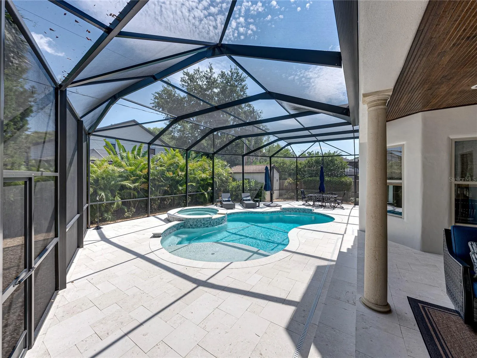 - In Ground, Gunite, Salt Water, Screen Enclosure, Pool Sweep