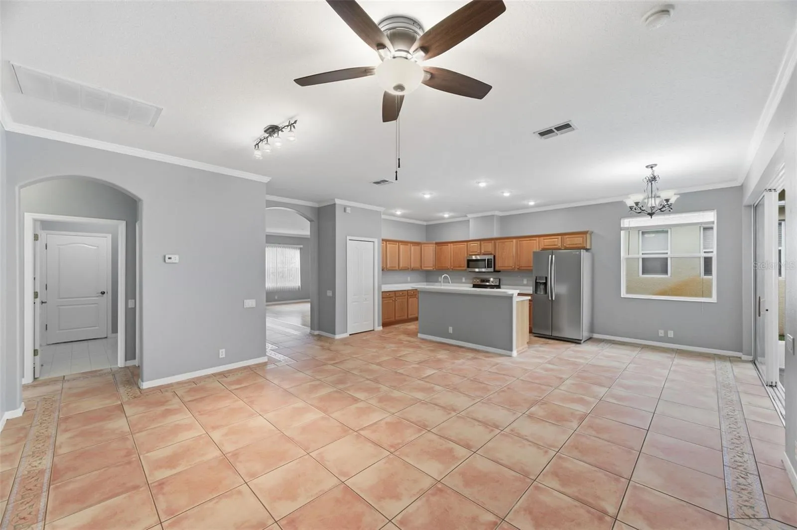 - Crown Molding, Open Floorplan, Thermostat, Walk-In Closet(s), Living Room/Dining Room Combo, Eat-in Kitchen, Kitchen/Family Room Combo, Primary Bedroom Main Floor, Split Bedroom, Window Treatments, High Ceilings, Stone Counters, Solid Wood Cabinets, Solid Surface Counters, Tray Ceiling(s)