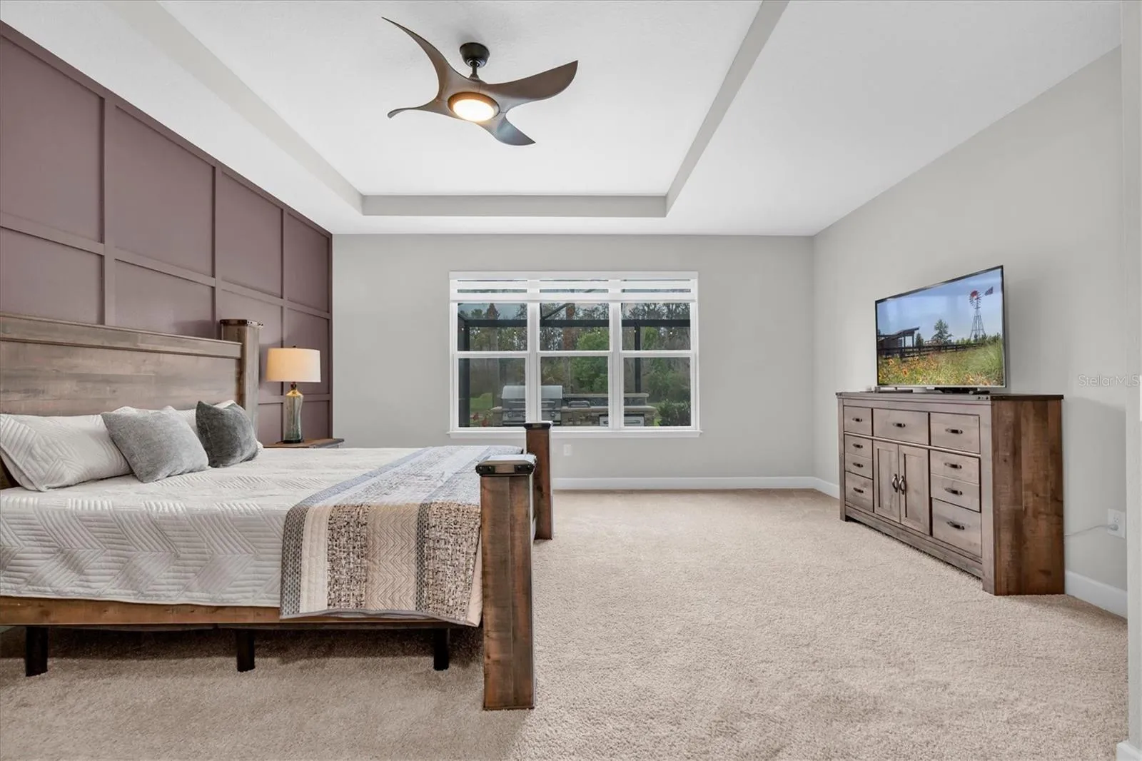 Large main-floor primary suite is a peaceful escape with pool views, a custom accent wall, ensuite bath, dual vanities, a walk-in closet, and a spa-style shower.