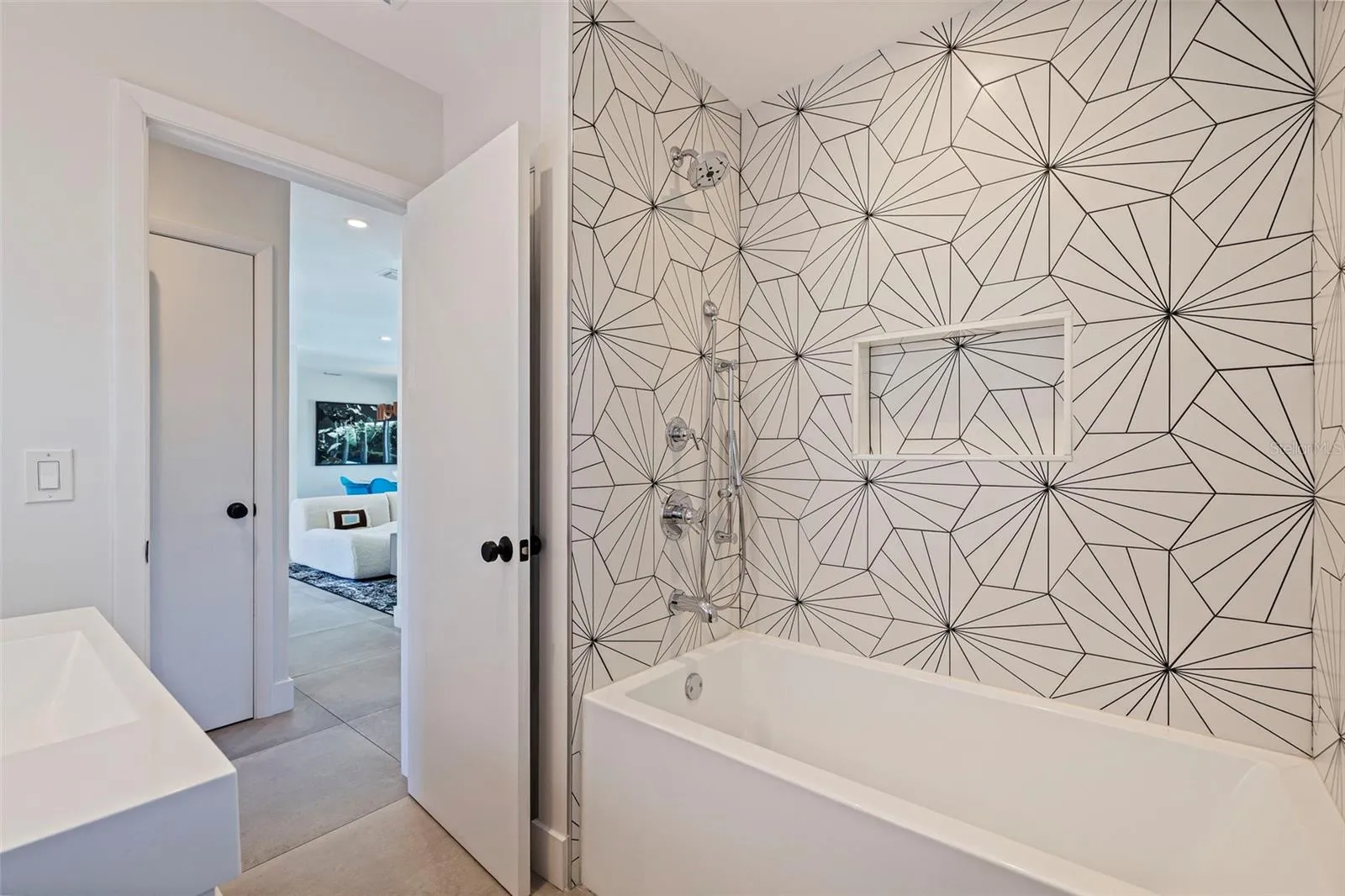 Inside, the home has been curated with a modern, design forward feel. The beautifully updated kitchen is complete with sleek cabinetry, quartz countertops, stainless steel appliances, and a full-height designer tile backsplash. And a large window above the kitchen sink overlooking the Clusia lined entrance.