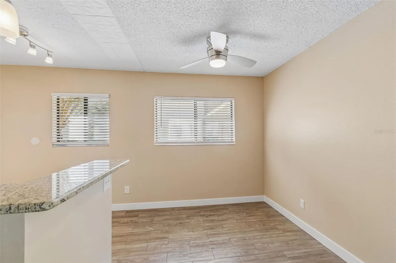 wood-look tile flooring, fresh interior paint, and an updated kitchen featuring granite