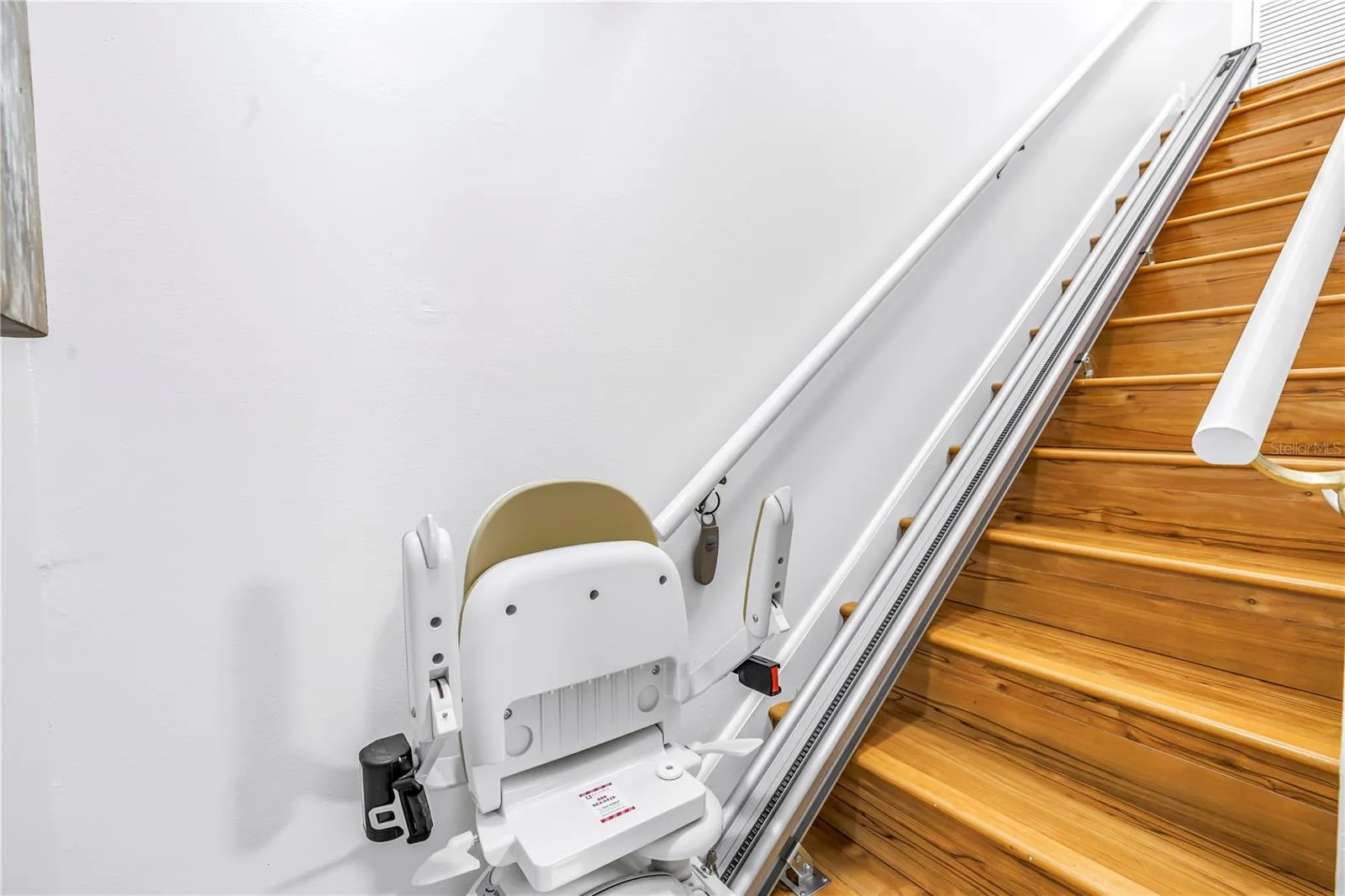 Upstairs, you’ll find two spacious bedrooms and two full bathrooms. The primary suite features deep closet, and an updated en-suite with dual sinks, granite counters, and a large walk-in shower. The guest bedroom is generously sized with a walk-in closet and access to an updated guest bath, providing comfort and privacy for visitors. Additional features include hurricane impact windows and doors throughout and a chairlift for easy access to the second floor.