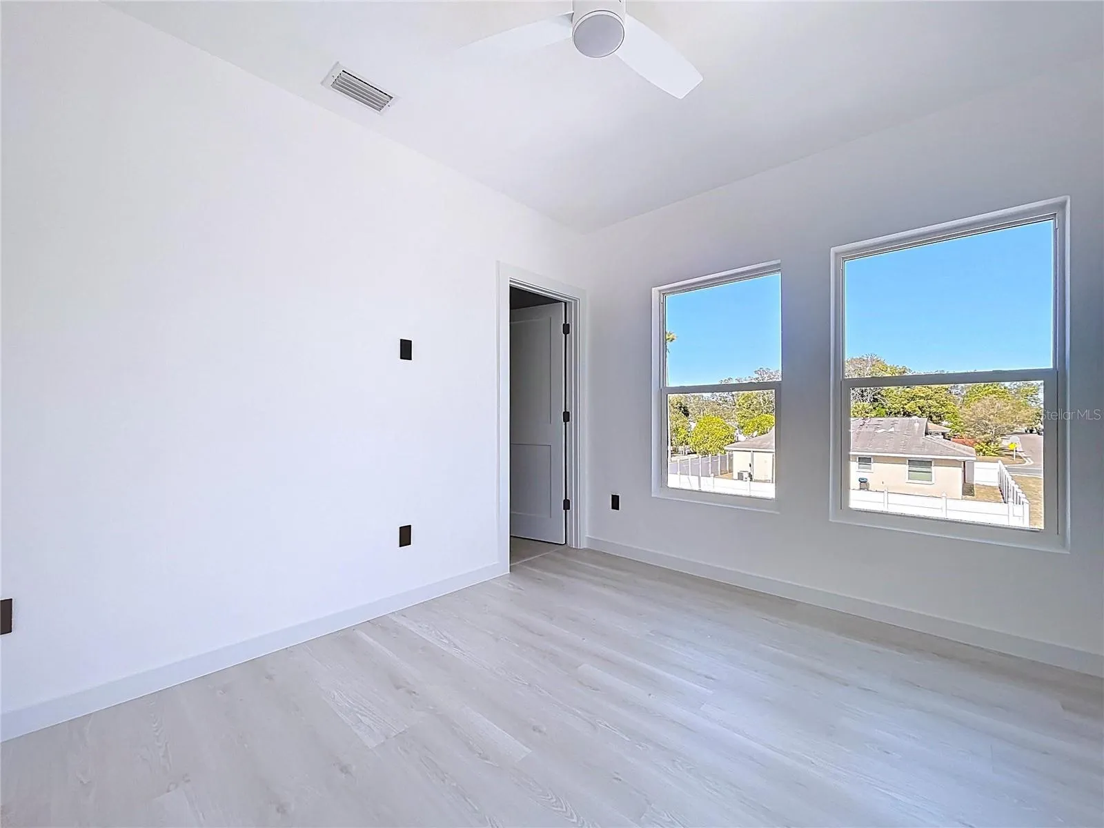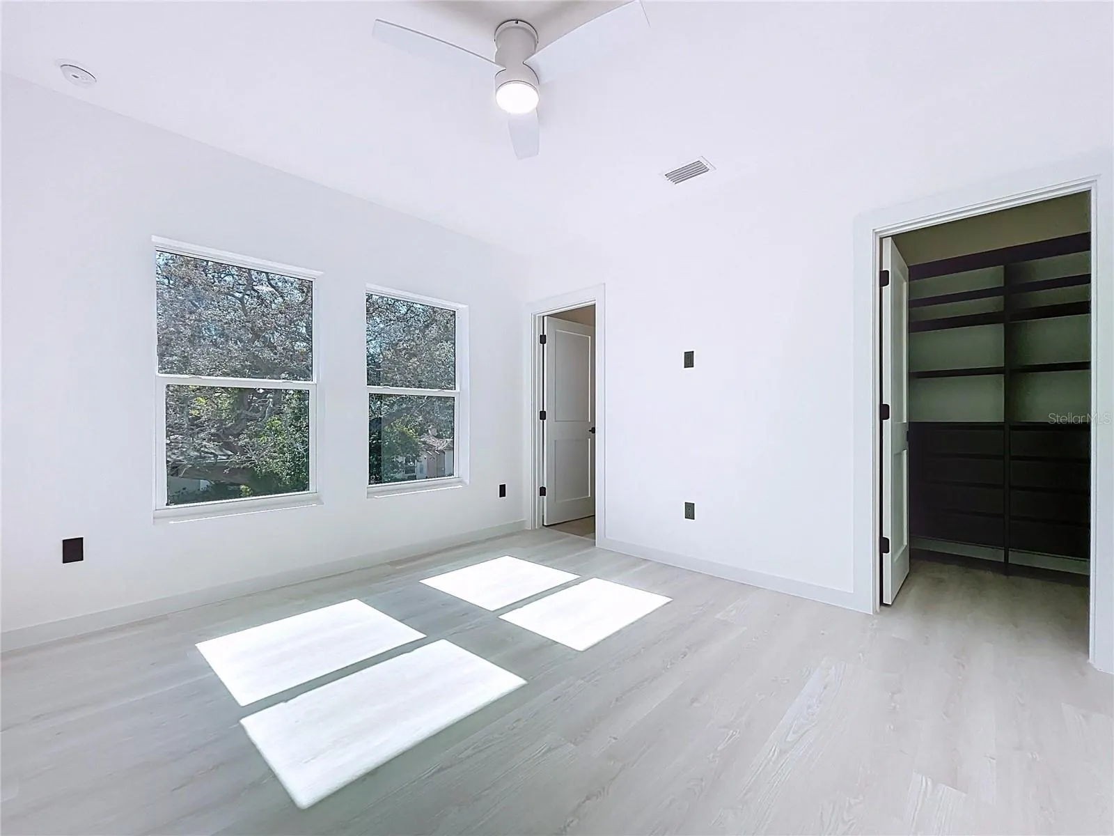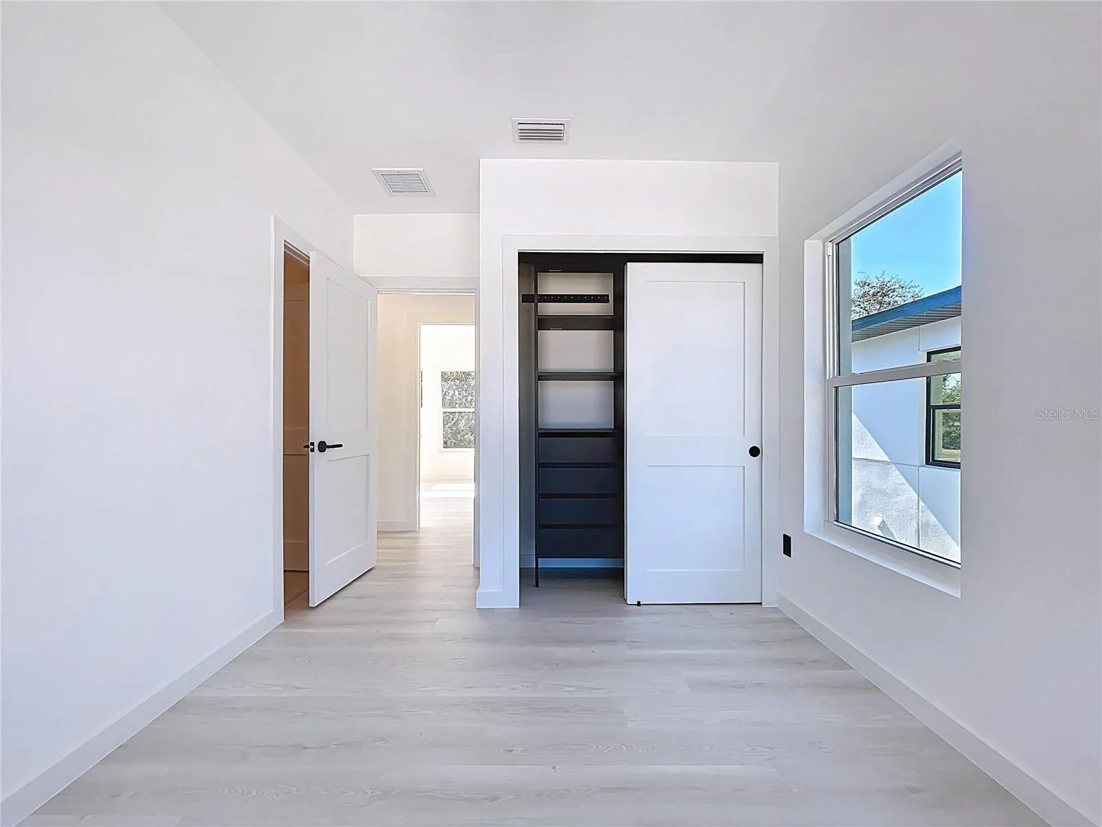Inside the house you’ll find solid wood interior and closet doors. Layout feels bright too because of 23 impact rated windows plus glass hurricane rated patio doors, so the whole place gets plenty of natural light. Roof insulated with spray foam, and HVAC units and ductwork is inside the conditioned space and in dedicated closets, which helps keep home more energy efficient and HVAC system lasting longer.