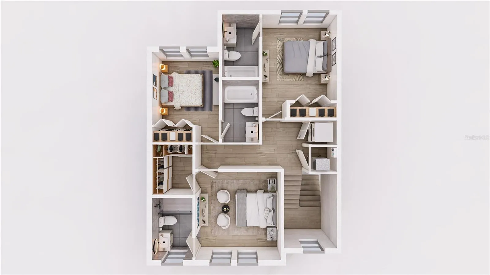 Upstairs you will find three bedrooms, and each one has its own full bathroom. That’s a big deal and game changer. It means everyone gets their own space and privacy, and it makes mornings and evenings easier for multi generational families. Bathrooms also have much more storage space than you usually see and motion activated under vanities lights.