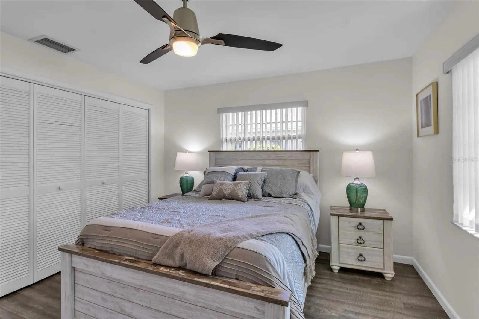 The primary suite offers a walk-in closet and updated en-suite bath with quartz countertops, modern cabinetry, and walk-in shower. The guest bedroom provides comfortable accommodations, and the second bath features updated finishes and a tub/shower combination.