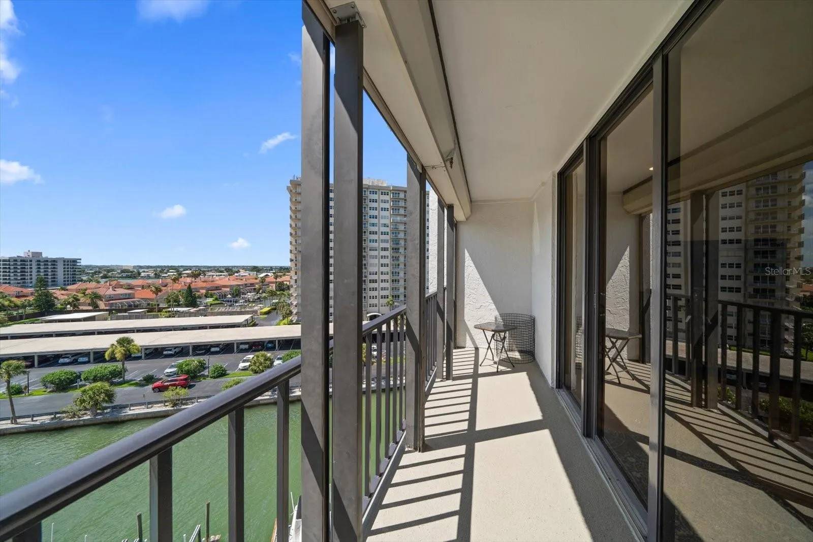 Perfect for entertaining, the state-of-the-art kitchen features new quartz counters, top-of-the-line Beko appliances, soft-close kitchen cabinetry and a separate sliding door for easy access to the expansive western-facing balcony. The primary bedroom suite includes a large walk-in closet, smart touch mirrors, and a contoured tile shower with a multi-head shower system featuring a rain shower head. This suite also offers exclusive access to a private balcony, providing a stunning 180-degree panoramic view of the Intracoastal Waterway, picturesque sunrises and the community marina.
