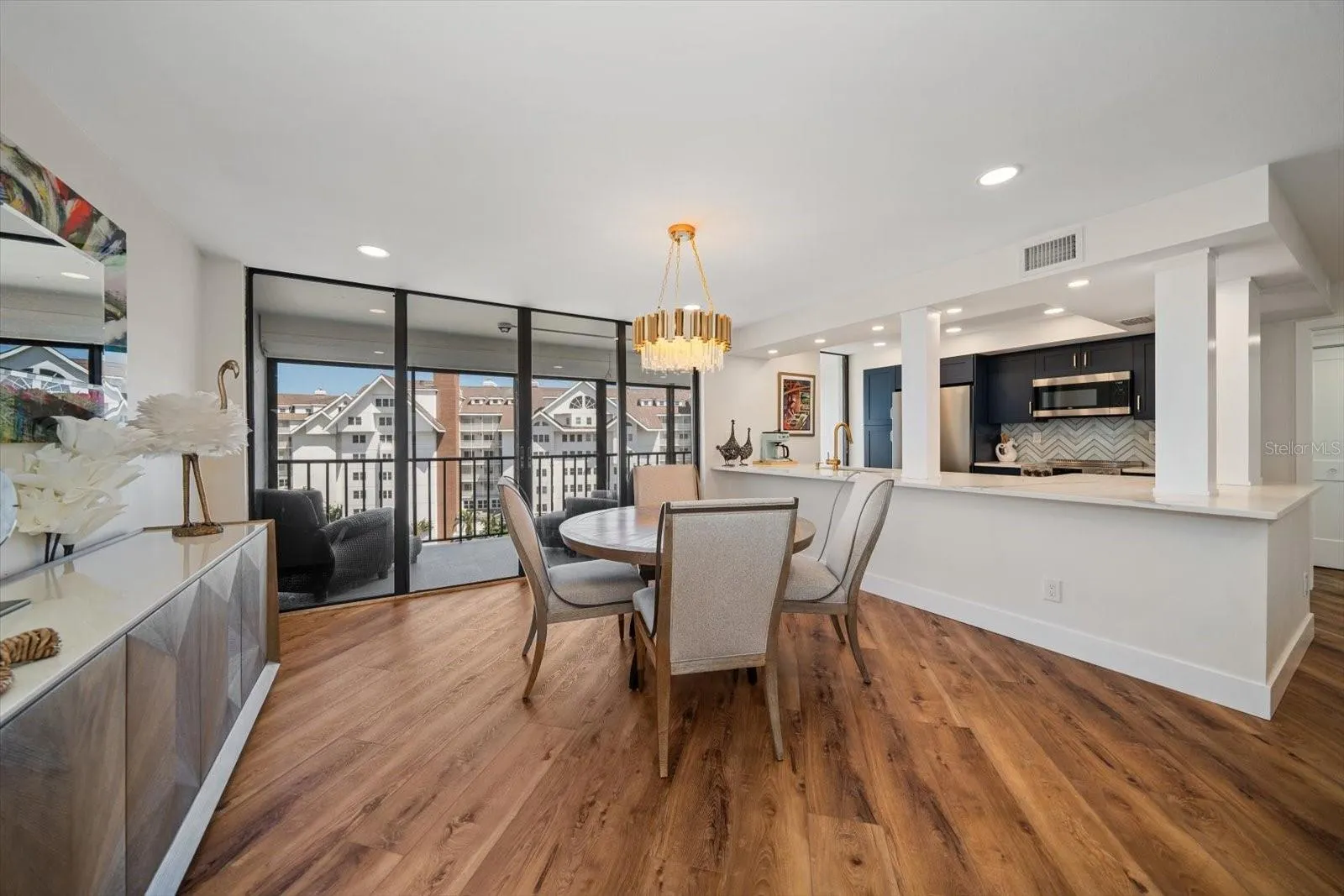 The living room boasts a large picture window showcasing beautiful southern views of Sand Key and the Belleair Beach coastline, offering sunset views at various times of the year. A sprawling western-facing balcony provides partial sight lines to the Gulf of Mexico. The open layout is thoughtfully designed to maximize comfort and spectacular views, with no expense spared on finishes.