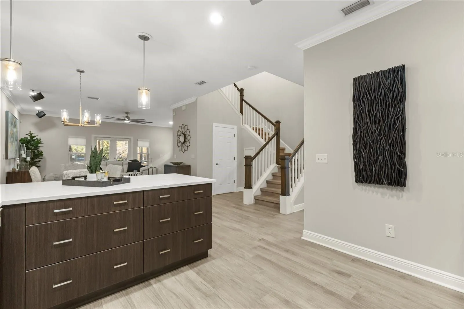 Thoughtfully redesigned throughout, the home balances sleek contemporary finishes with warm, inviting spaces, showcasing a level of attention to detail that is immediately felt. The main level features a bright, spacious kitchen appointed with quartz countertops and streamlined European-style cabinetry, opening effortlessly to expansive living and dining areas ideal for both everyday living and entertaining.