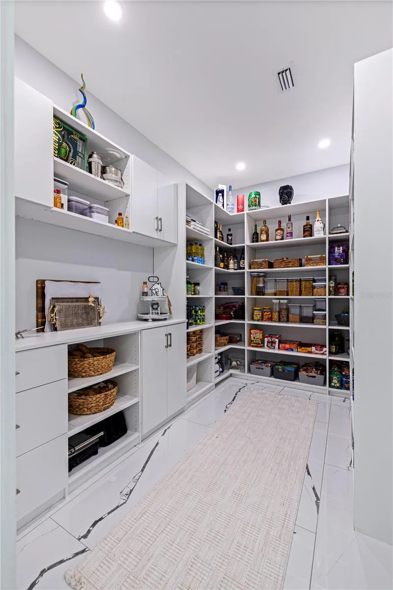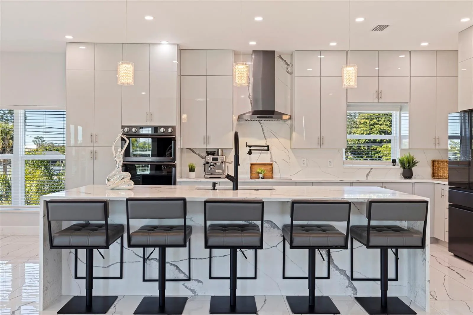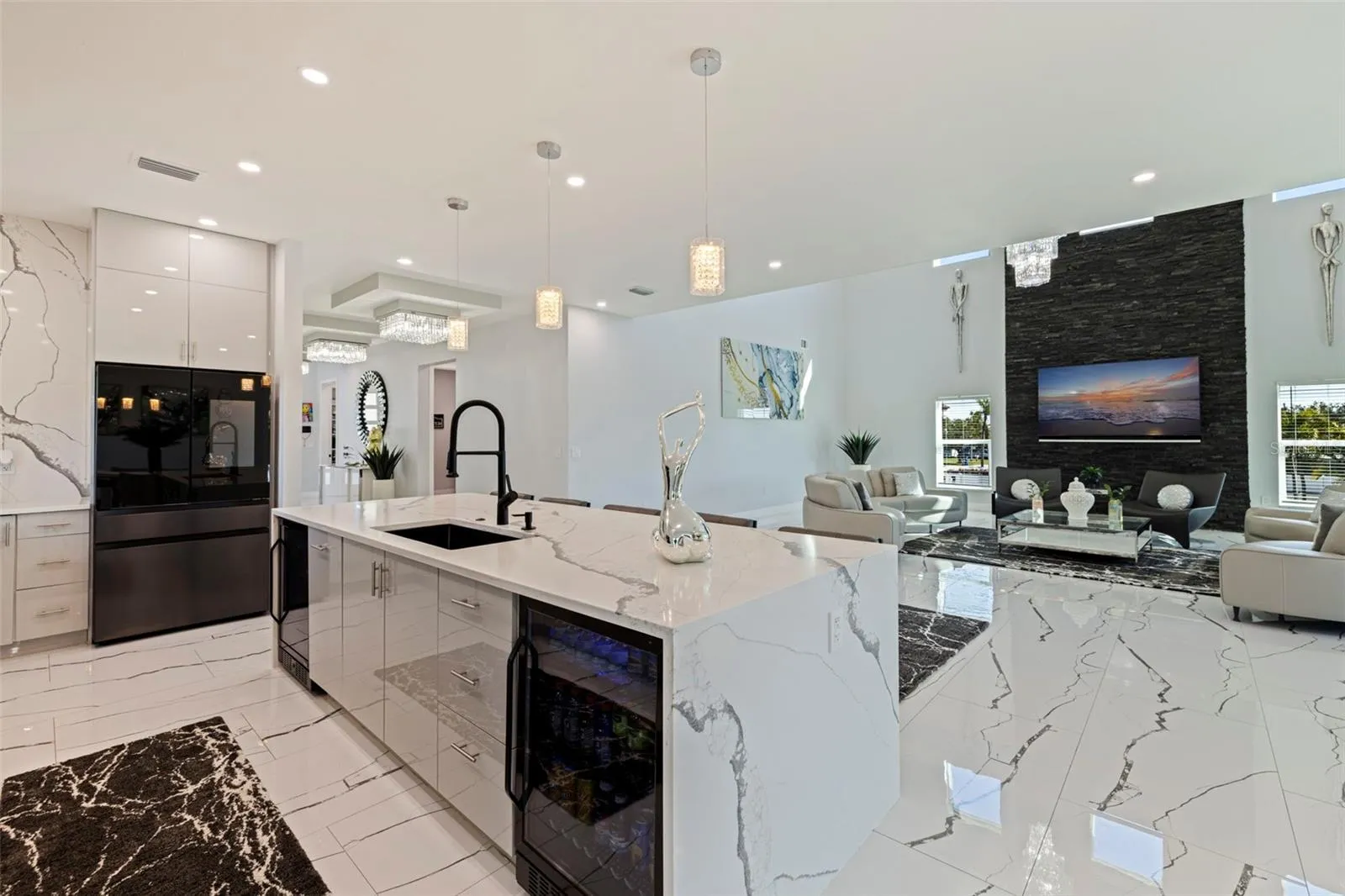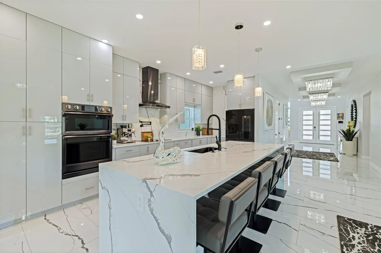 A striking statement of modern luxury, this newly constructed 2023 residence offers over 5,100 square feet of thoughtfully designed living space and more than 9,100 square feet under roof, blending bold architecture, elevated finishes, and resort-style living. Grand front steps lead to dramatic double frosted glass entry doors. Inside, a gallery-style foyer features high-gloss marble-style flooring, layered recessed tray ceilings, and a stunning series of crystal chandeliers that establish the home’s refined, design-forward aesthetic. Thoughtfully layered lighting enhances architectural impact throughout. The main living area impresses with soaring ceilings, expansive walls of glass, and an open mezzanine overlook, creating a bright, connected living experience with dramatic vertical volume. The kitchen is designed for both everyday living and entertaining, anchored by a massive waterfall-edge island and complemented by sleek cabinetry, wall oven, cooktop, pot filler, and two built-in beverage refrigerators. A substantial walk-in pantry with custom shelving adds exceptional storage, while the space flows seamlessly into the dining and living areas. This five-bedroom, six-bath home offers a highly functional layout. Four bedrooms are upstairs, including a private guest suite with en suite bath. One additional bedroom with full bath is located on the main level. A dedicated pool bath, upstairs family room overlooking the main living area, and two laundry rooms, one upstairs and one downstairs, enhance everyday convenience. The primary suite is a private retreat featuring a statement accent wall, custom cut tray ceiling, and designer chandelier. The spa-inspired bath includes a massive walk-in shower with multiple showerheads and rain head, freestanding soaking tub, and a single vanity with dual sinks and an illuminated mirror. A glass-enclosed boutique-style display closet, additional oversized walk-in closet, and private balcony with electric blinds and water views complete the suite. Outdoor living rivals a private resort, with expansive terraces and patios finished in premium honed natural marble. The pool features a sun shelf and integrated spa and is complemented by a fully equipped outdoor kitchen and multiple lounge and dining areas ideal for entertaining. The exceptionally expansive garage is fully finished with polished epoxy floors, recessed lighting, and soaring ceilings, offering space for high-end vehicle collections, a golf cart, or recreational toys, with capacity for approximately ten vehicles. A game or lounge setup with pool table and an interior overlook from the main level elevate the space beyond a traditional garage. The home is fully hurricane rated with impact windows and impact-rated doors throughout. Storage is abundant, from custom closets and built-ins to pantry and garage capacity. This bold modern residence delivers scale, design, and craftsmanship in one exceptional offering. Ideally located within a sought-after waterfront community in the desirable Northeast area, the home is surrounded by scenic waterways, neighborhood parks, and playgrounds, offering an exceptional balance of luxury living and everyday convenience. Residents enjoy walkable green spaces, water access, and a golf cart–friendly lifestyle, with easy access to Islander Market, along with access to A-rated Shore Acres Elementary School and just minutes from vibrant downtown dining and shopping.