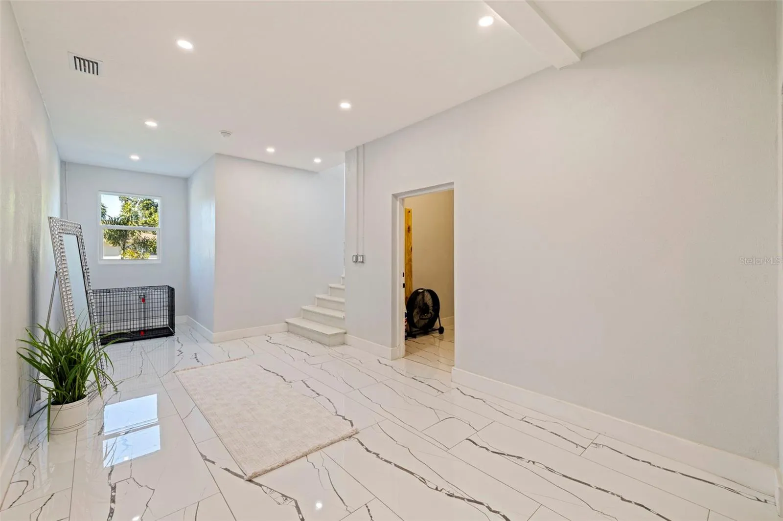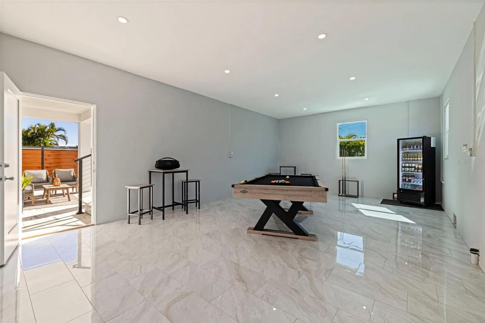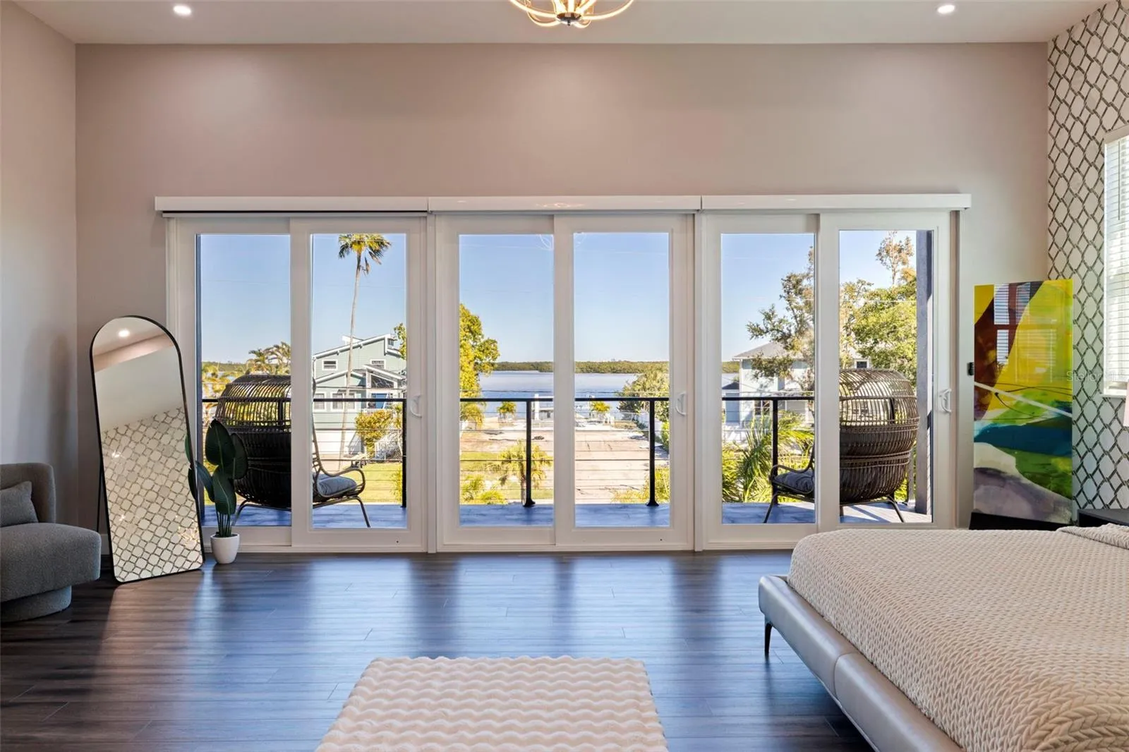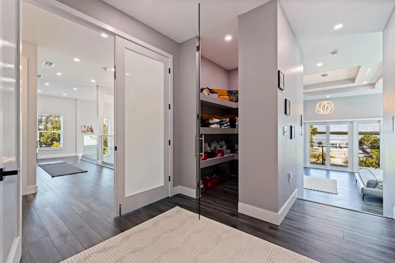 A striking statement of modern luxury, this newly constructed 2023 residence offers over 5,100 square feet of thoughtfully designed living space and more than 9,100 square feet under roof, blending bold architecture, elevated finishes, and resort-style living. Grand front steps lead to dramatic double frosted glass entry doors. Inside, a gallery-style foyer features high-gloss marble-style flooring, layered recessed tray ceilings, and a stunning series of crystal chandeliers that establish the home’s refined, design-forward aesthetic. Thoughtfully layered lighting enhances architectural impact throughout. The main living area impresses with soaring ceilings, expansive walls of glass, and an open mezzanine overlook, creating a bright, connected living experience with dramatic vertical volume. The kitchen is designed for both everyday living and entertaining, anchored by a massive waterfall-edge island and complemented by sleek cabinetry, wall oven, cooktop, pot filler, and two built-in beverage refrigerators. A substantial walk-in pantry with custom shelving adds exceptional storage, while the space flows seamlessly into the dining and living areas. This five-bedroom, six-bath home offers a highly functional layout. Four bedrooms are upstairs, including a private guest suite with en suite bath. One additional bedroom with full bath is located on the main level. A dedicated pool bath, upstairs family room overlooking the main living area, and two laundry rooms, one upstairs and one downstairs, enhance everyday convenience. The primary suite is a private retreat featuring a statement accent wall, custom cut tray ceiling, and designer chandelier. The spa-inspired bath includes a massive walk-in shower with multiple showerheads and rain head, freestanding soaking tub, and a single vanity with dual sinks and an illuminated mirror. A glass-enclosed boutique-style display closet, additional oversized walk-in closet, and private balcony with electric blinds and water views complete the suite. Outdoor living rivals a private resort, with expansive terraces and patios finished in premium honed natural marble. The pool features a sun shelf and integrated spa and is complemented by a fully equipped outdoor kitchen and multiple lounge and dining areas ideal for entertaining. The exceptionally expansive garage is fully finished with polished epoxy floors, recessed lighting, and soaring ceilings, offering space for high-end vehicle collections, a golf cart, or recreational toys, with capacity for approximately ten vehicles. A game or lounge setup with pool table and an interior overlook from the main level elevate the space beyond a traditional garage. The home is fully hurricane rated with impact windows and impact-rated doors throughout. Storage is abundant, from custom closets and built-ins to pantry and garage capacity. This bold modern residence delivers scale, design, and craftsmanship in one exceptional offering. Ideally located within a sought-after waterfront community in the desirable Northeast area, the home is surrounded by scenic waterways, neighborhood parks, and playgrounds, offering an exceptional balance of luxury living and everyday convenience. Residents enjoy walkable green spaces, water access, and a golf cart–friendly lifestyle, with easy access to Islander Market, along with access to A-rated Shore Acres Elementary School and just minutes from vibrant downtown dining and shopping.