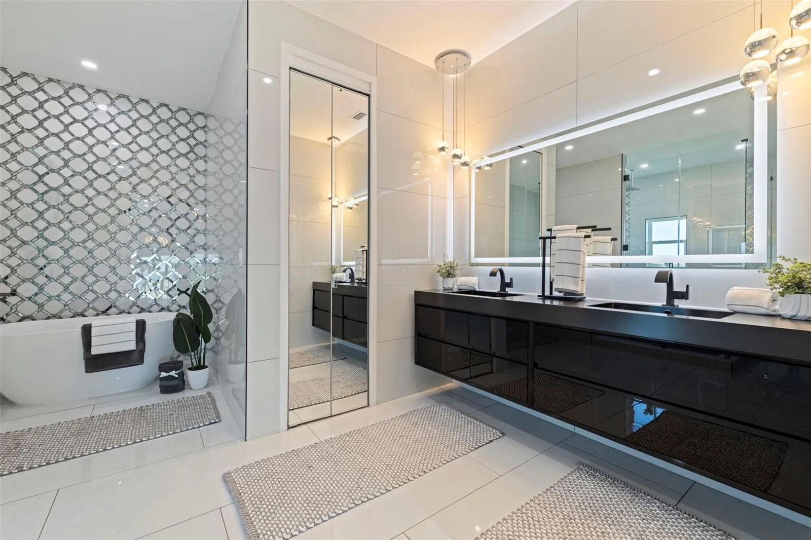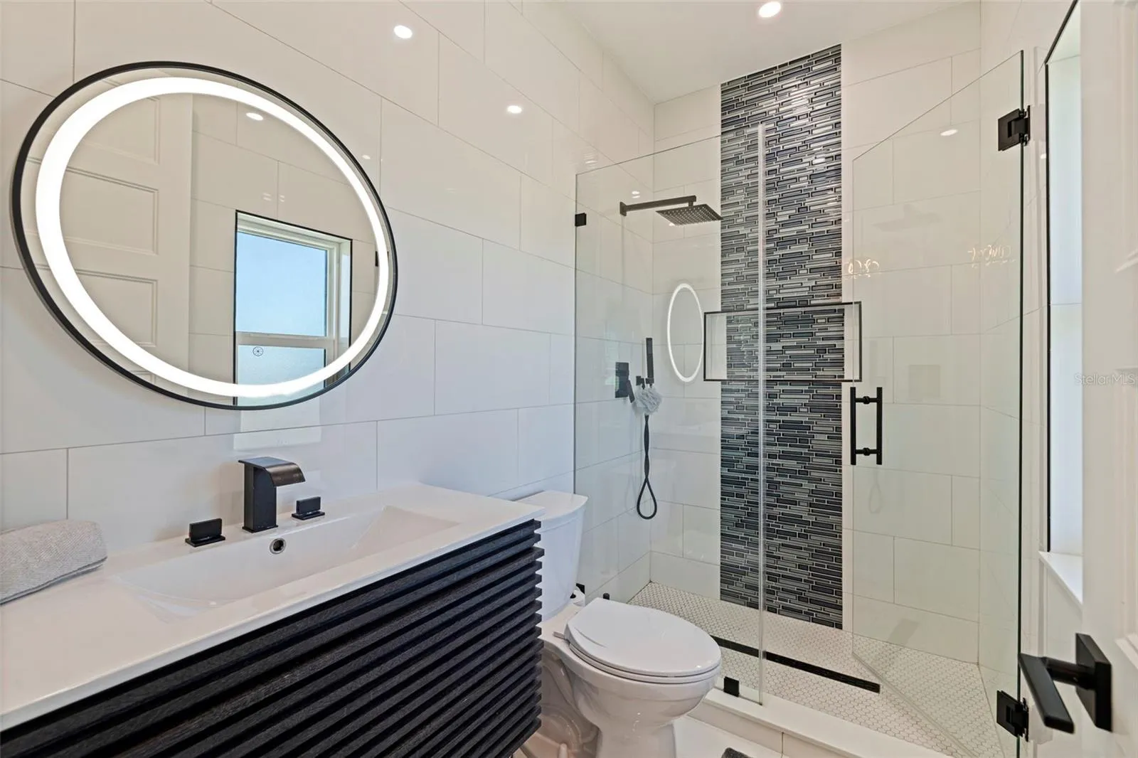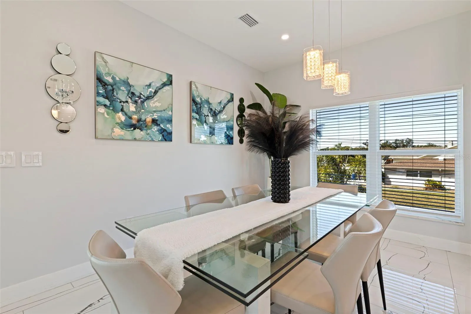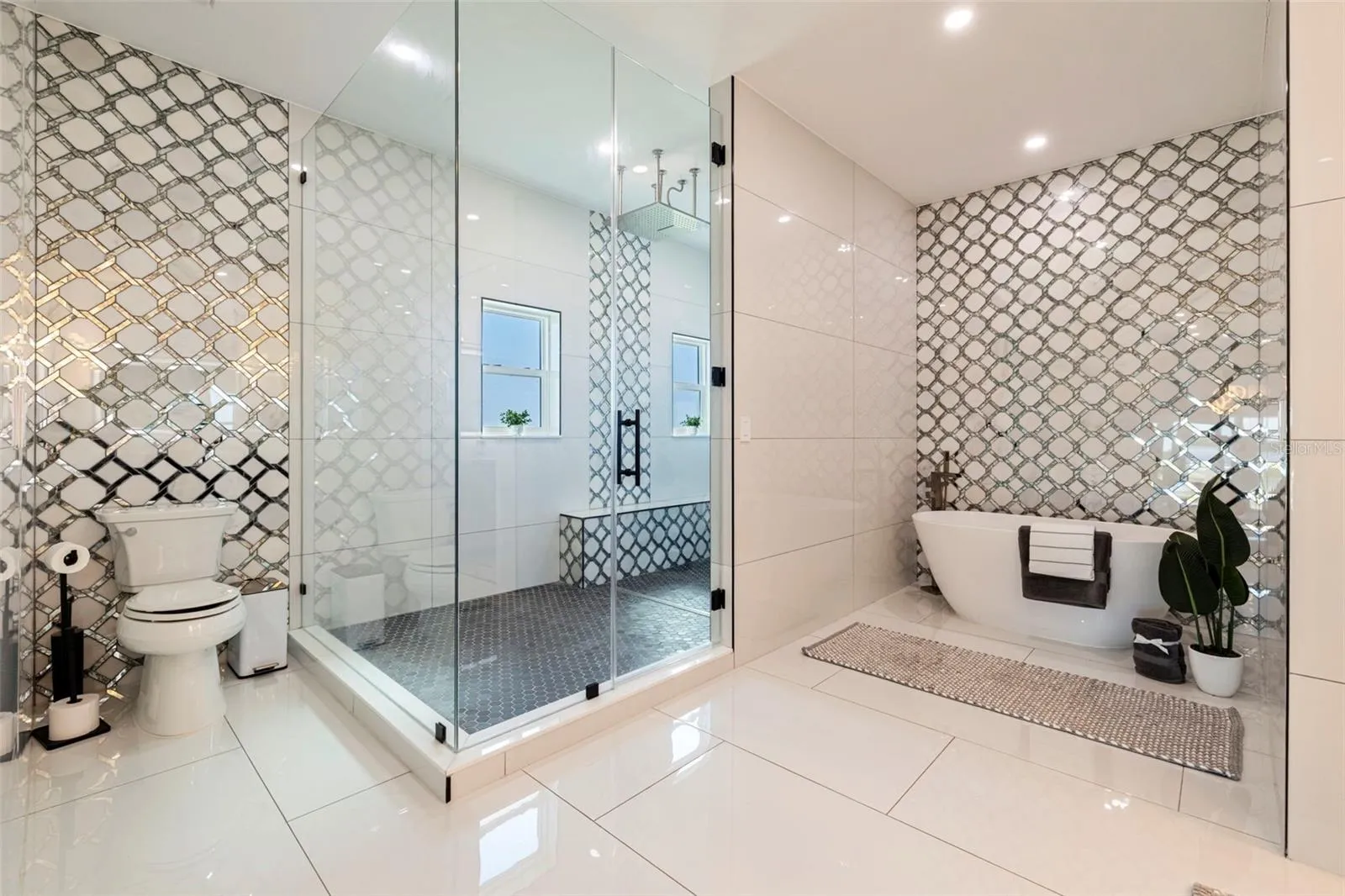 A striking statement of modern luxury, this newly constructed 2023 residence offers over 5,100 square feet of thoughtfully designed living space and more than 9,100 square feet under roof, blending bold architecture, elevated finishes, and resort-style living. Grand front steps lead to dramatic double frosted glass entry doors. Inside, a gallery-style foyer features high-gloss marble-style flooring, layered recessed tray ceilings, and a stunning series of crystal chandeliers that establish the home’s refined, design-forward aesthetic. Thoughtfully layered lighting enhances architectural impact throughout. The main living area impresses with soaring ceilings, expansive walls of glass, and an open mezzanine overlook, creating a bright, connected living experience with dramatic vertical volume. The kitchen is designed for both everyday living and entertaining, anchored by a massive waterfall-edge island and complemented by sleek cabinetry, wall oven, cooktop, pot filler, and two built-in beverage refrigerators. A substantial walk-in pantry with custom shelving adds exceptional storage, while the space flows seamlessly into the dining and living areas. This five-bedroom, six-bath home offers a highly functional layout. Four bedrooms are upstairs, including a private guest suite with en suite bath. One additional bedroom with full bath is located on the main level. A dedicated pool bath, upstairs family room overlooking the main living area, and two laundry rooms, one upstairs and one downstairs, enhance everyday convenience. The primary suite is a private retreat featuring a statement accent wall, custom cut tray ceiling, and designer chandelier. The spa-inspired bath includes a massive walk-in shower with multiple showerheads and rain head, freestanding soaking tub, and a single vanity with dual sinks and an illuminated mirror. A glass-enclosed boutique-style display closet, additional oversized walk-in closet, and private balcony with electric blinds and water views complete the suite. Outdoor living rivals a private resort, with expansive terraces and patios finished in premium honed natural marble. The pool features a sun shelf and integrated spa and is complemented by a fully equipped outdoor kitchen and multiple lounge and dining areas ideal for entertaining. The exceptionally expansive garage is fully finished with polished epoxy floors, recessed lighting, and soaring ceilings, offering space for high-end vehicle collections, a golf cart, or recreational toys, with capacity for approximately ten vehicles. A game or lounge setup with pool table and an interior overlook from the main level elevate the space beyond a traditional garage. The home is fully hurricane rated with impact windows and impact-rated doors throughout. Storage is abundant, from custom closets and built-ins to pantry and garage capacity. This bold modern residence delivers scale, design, and craftsmanship in one exceptional offering. Ideally located within a sought-after waterfront community in the desirable Northeast area, the home is surrounded by scenic waterways, neighborhood parks, and playgrounds, offering an exceptional balance of luxury living and everyday convenience. Residents enjoy walkable green spaces, water access, and a golf cart–friendly lifestyle, with easy access to Islander Market, along with access to A-rated Shore Acres Elementary School and just minutes from vibrant downtown dining and shopping.