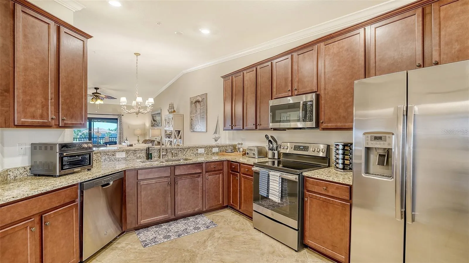 - Ceiling Fans(s), Living Room/Dining Room Combo, Eat-in Kitchen, Stone Counters, Solid Wood Cabinets, Dry Bar