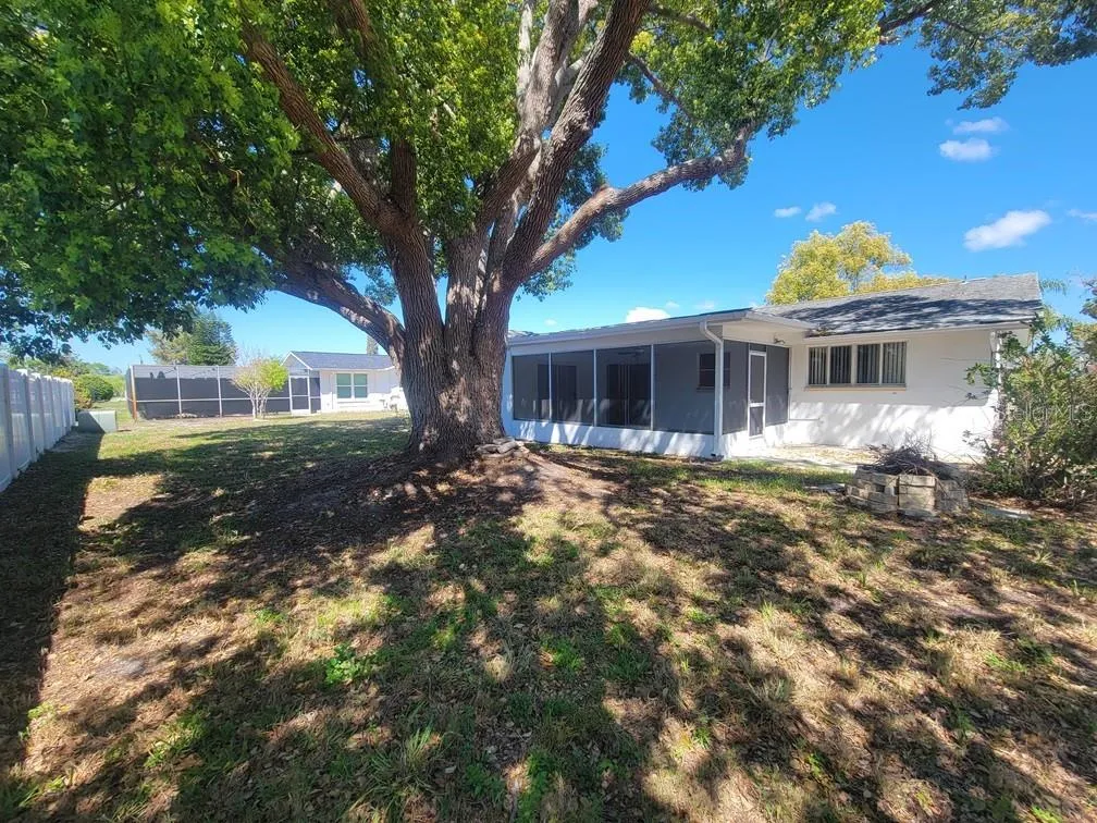 Step outside to a large screened-in patio overlooking a spacious backyard with a mature shade tree—perfect for enjoying Florida living. The home also features a covered front porch, a large 2-car garage with washer and dryer hookups, and a long driveway for ample parking.