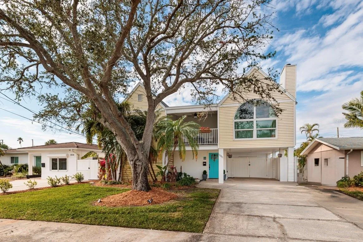 Priced to Sell! Welcome to your tropical oasis in Northeast St. Petersburg! This stunning 3-bedroom, 2-bathroom Key West style stilt home offers a serene retreat in one of St. Petersburg’s most desirable communities. Elevated construction ensures peace of mind, while thoughtful renovations and an expansive backyard create the perfect environment for Florida living. Step inside to discover vaulted ceilings and a dramatic floor-to-ceiling bay window (replaced in 2024) that fills the home with natural light. Two covered balconies extend from the main living areas, offering tranquil views of the landscaped front yard and the oversized backyard. The cozy living room, centered around a wood-burning fireplace, provides a perfect gathering spot for cooler evenings. The updated kitchen features natural stone countertops, stainless steel appliances, and a spacious walk-in pantry. The master bedroom is a true retreat, boasting a spa-style ensuite bathroom with herringbone slate tile, marble countertops, and a walk-in shower. Behind a sleek pocket door lies a custom-designed closet system. Outdoor living is a dream with a large backyard designed for entertaining. A covered patio provides designated spaces for dining, grilling, and lounging, while the recently installed irrigation system keeps the lush landscaping low-maintenance year-round. A spacious, locked workshop offers additional storage. Located just minutes from vibrant downtown St. Petersburg, this home offers the best of city and coastal life. Explore museums, waterfront dining, and boutique shopping, all within easy reach. Families will appreciate being just around the corner from Shore Acres Elementary and a short golf cart ride to the newly constructed Mangrove Bay Middle School and YMCA. Outdoor enthusiasts will love the home’s proximity to Weedon Island Nature Preserve, a hidden gem and fisherman’s dream, with 4-miles of paddling trails through mangrove tunnels teaming with wildlife. A few blocks away, Denver Park offers tennis, pickleball, basketball, and sand volleyball courts as well as baseball fields and a shaded playground. Don’t miss your chance to make this tropical oasis your forever home – schedule your private showing today!