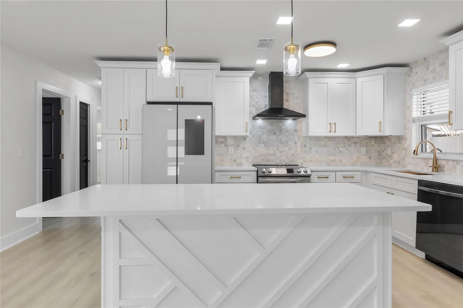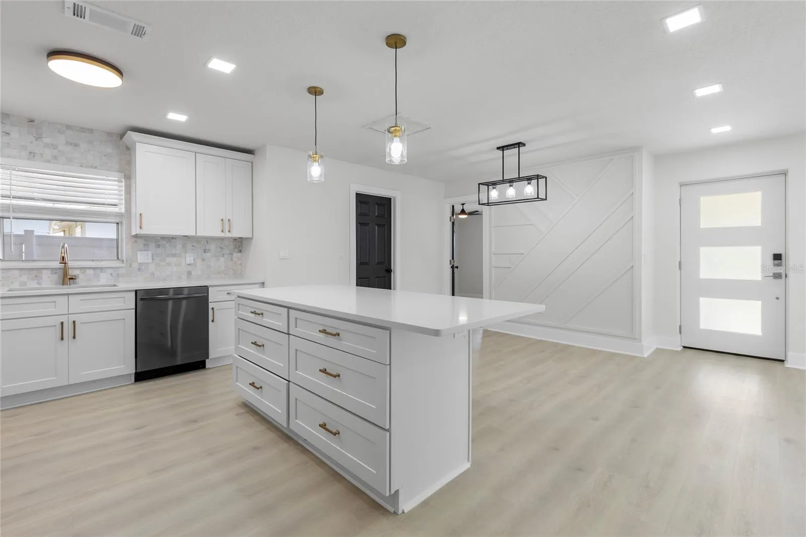Spanning approximately 1,538 square feet, this property features a completely renovated kitchen with stainless steel appliances, including a state-of-the-art touchscreen refrigerator, stainless steel farm sink, soft close cabinets accented by champagne bronze fixtures, and a stylish mosaic tile backsplash. The luxury vinyl plank flooring throughout the home adds a touch of elegance and ease of maintenance.