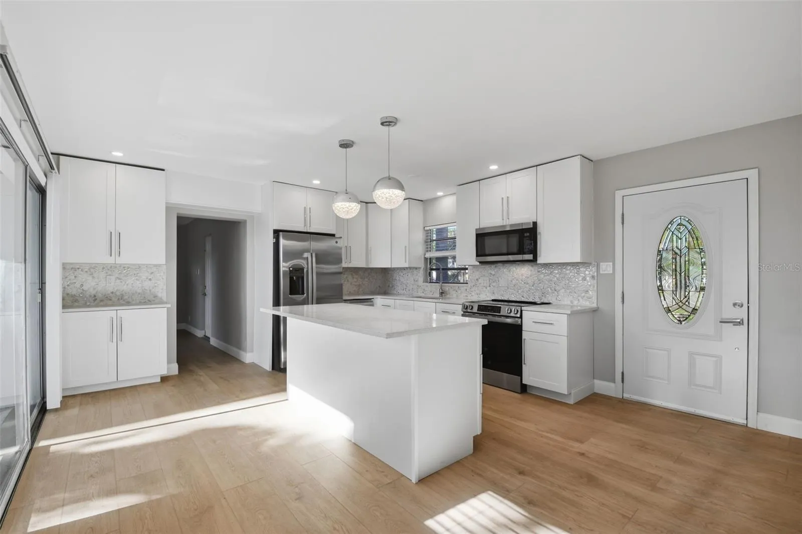 Step inside to find a modern, open feel with high-end luxury vinyl plank flooring throughout and a freshly painted interior and exterior. The stunning kitchen is the heart of the home, featuring a large center island, sleek finishes, and brand-new stainless-steel appliances—perfect for both everyday living and entertaining.