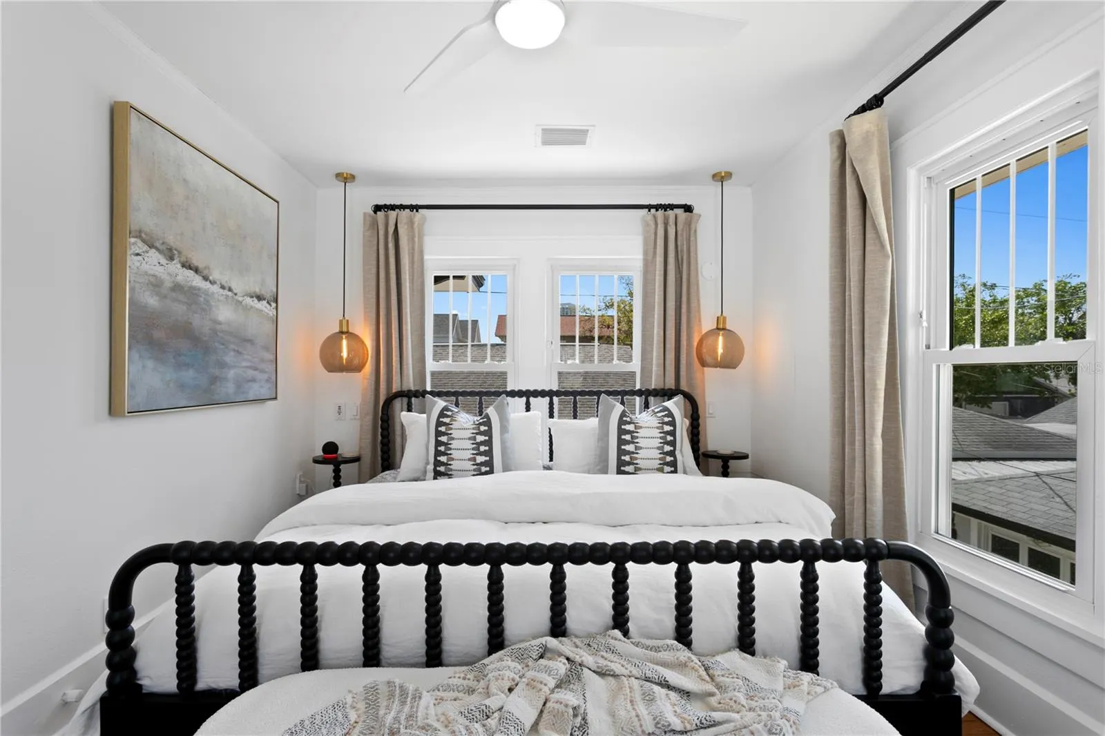 This beautifully updated three bed plus a den/flex space, three bath, two-story bungalow offers a rare combination of historic charm, thoughtful modern upgrades, and a prime location in one of St. Pete’s most walkable and desirable Old Northeast neighborhood. Ideally located just four blocks from the waterfront at North Shore Park and seven blocks from the vibrant heart of downtown, this home puts you within easy reach of Beach Drive, the Pier, Tampa Bay, and endless shopping and dining options. The curb appeal makes an immediate impression, and inside, rich original hardwood floors and natural light set the tone for a space that feels both warm and refined. The front sunroom offers flexible functionality as a den, home office, or additional guest space with a sleeper sofas set up. The dedicated dining room flows seamlessly into a fully remodeled kitchen, featuring premium 2023 upgrades like a Viking gas range, new cabinetry, granite counter tops and a large walk-in pantry–ideal for any level of home chef. Upstairs, a split floor plan creates privacy between the primary suite and guest bedrooms. The primary bedroom includes an ensuite bath, while the updated guest bath sits conveniently between the bedrooms. Every major system has been thoughtfully upgraded for peace of mind: a new roof & new ductwork (2024), new impact-rated storm windows (2020), fully repiped plumbing (2020–2021), a tankless gas water heater (2017), new AC compressor (2021), water softener (2021), and an EVcharger outlet (2022). Step outside to a large fenced backyard with plenty of room for entertaining, play,gardening, or even a future pool. The detached one-car garage includes its own electrical panel, gas line and water access, offering flexibility for a potential guest suite, home gym, or creative studio (architectural designs included). Additional updates include a new irrigation system, fresh landscaping with a charming herb garden, new light fixtures, ceiling fans, and electrical outlets throughout, as well as new paint inside and out. All window treatments have been updated with stylish top-down, bottom-up shades. As a major bonus, this home is not in a flood zone, saving you thousands each year on insurance and “NO HURRICANE” damage. Opportunities like this don’t come often, where every detail has been considered, every upgrade already done, and the best of St.Pete is right outside your door. Come experience the charm, comfort, and convenience of Old Northeast living at its finest.