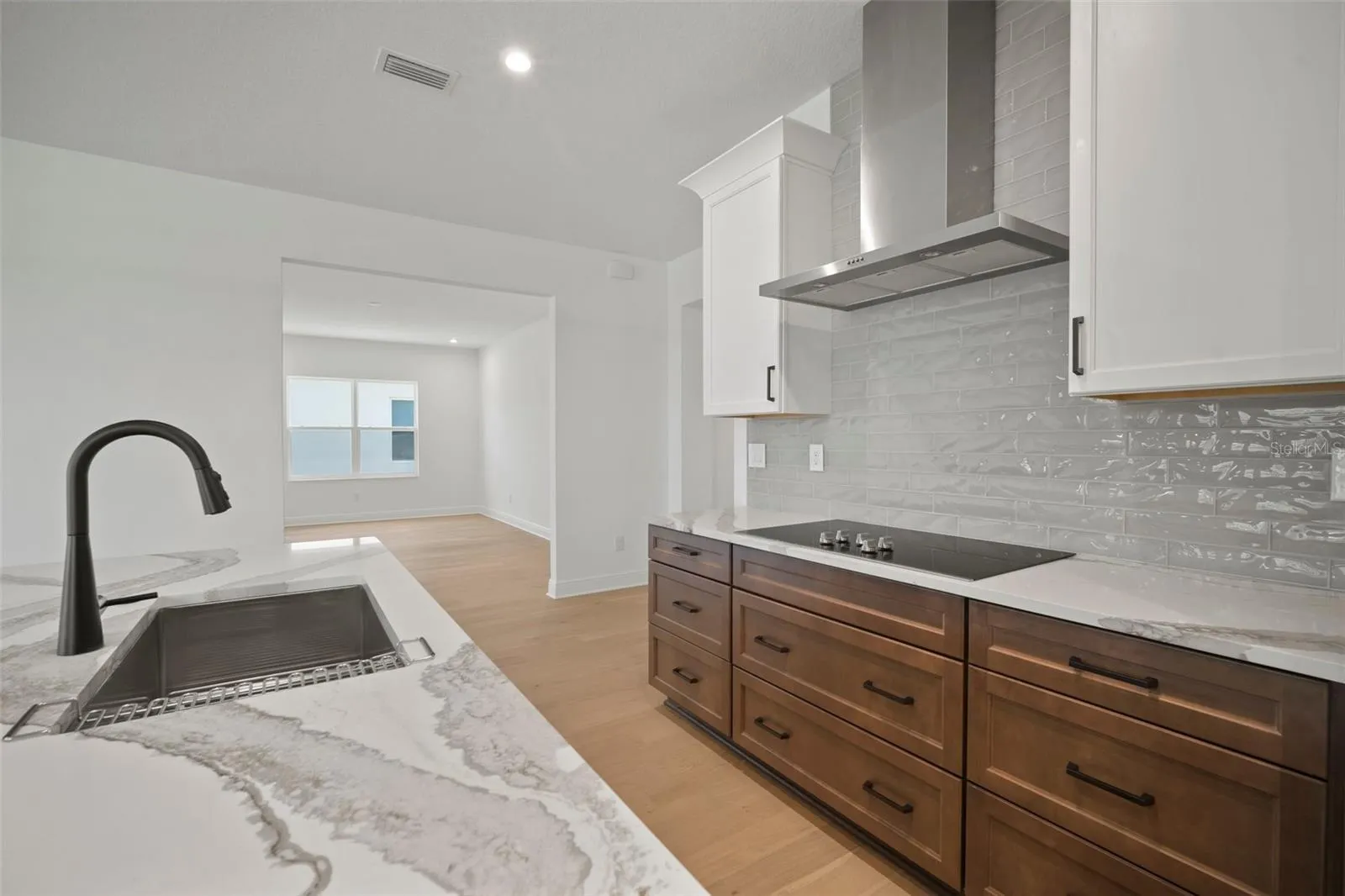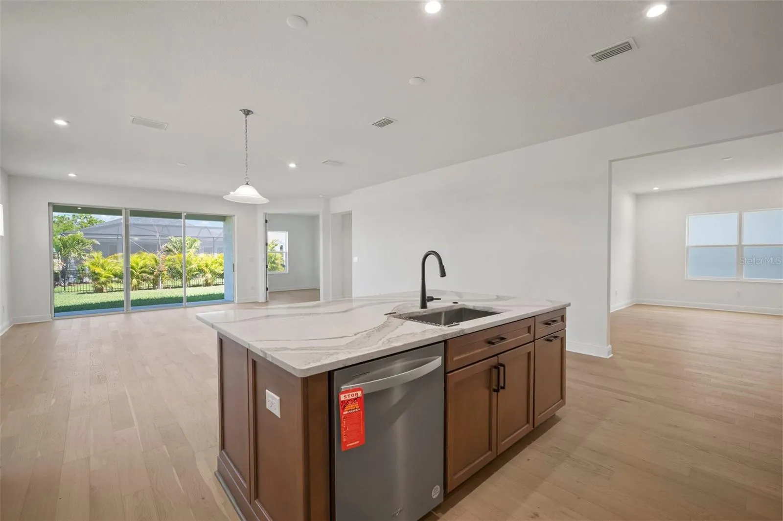 Step into an inviting, open-concept layout where the spacious living and kitchen areas blend seamlessly, perfect for both entertaining and everyday comfort. The kitchen boasts designer upgrades with high-end finishes and sleek quartz countertops, all looking out towards your large sliding glass doors in the open great room, providing lots of natural light. Gorgeous **engineered wood flooring** flows throughout the main living areas, enhancing the warmth of this ideal new home.
