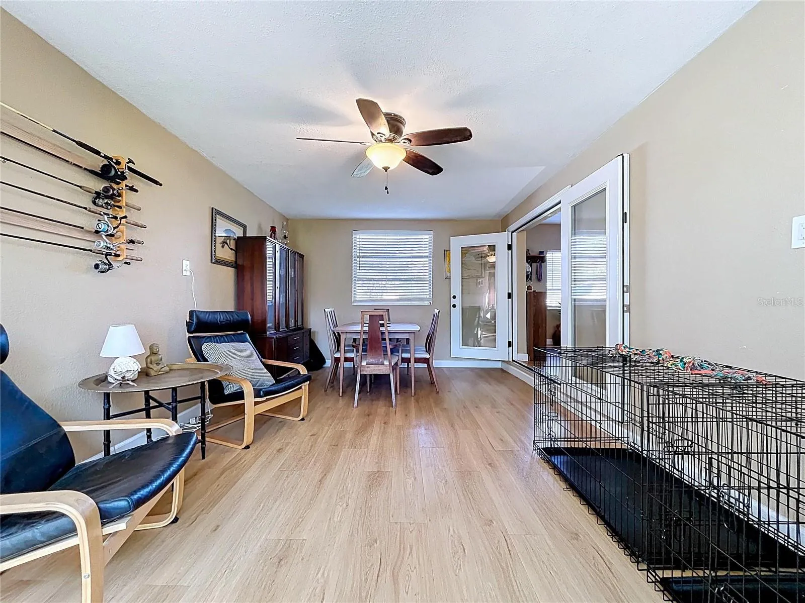 A spacious Florida room provides flexible living space and opens through a newer sliding glass door (2023) to a paver patio and expansive backyard featuring reclaimed-water irrigation and a 6×8 Wally Watt shed. The oversized yard offers endless possibilities and is large enough to accommodate a future pool, garden, play area, or outdoor entertaining space.