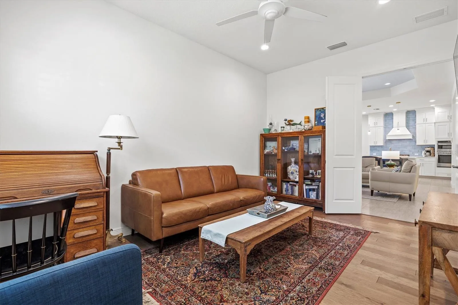 The primary suite is a true retreat, showcasing coffered ceilings, an oversized bedroom, and a spa-inspired bath with dual sinks, a floor-to-ceiling tiled walk-in shower, and private water closet. Two additional bedrooms, a beautifully appointed guest bath, and a versatile den/office provide flexible living options.