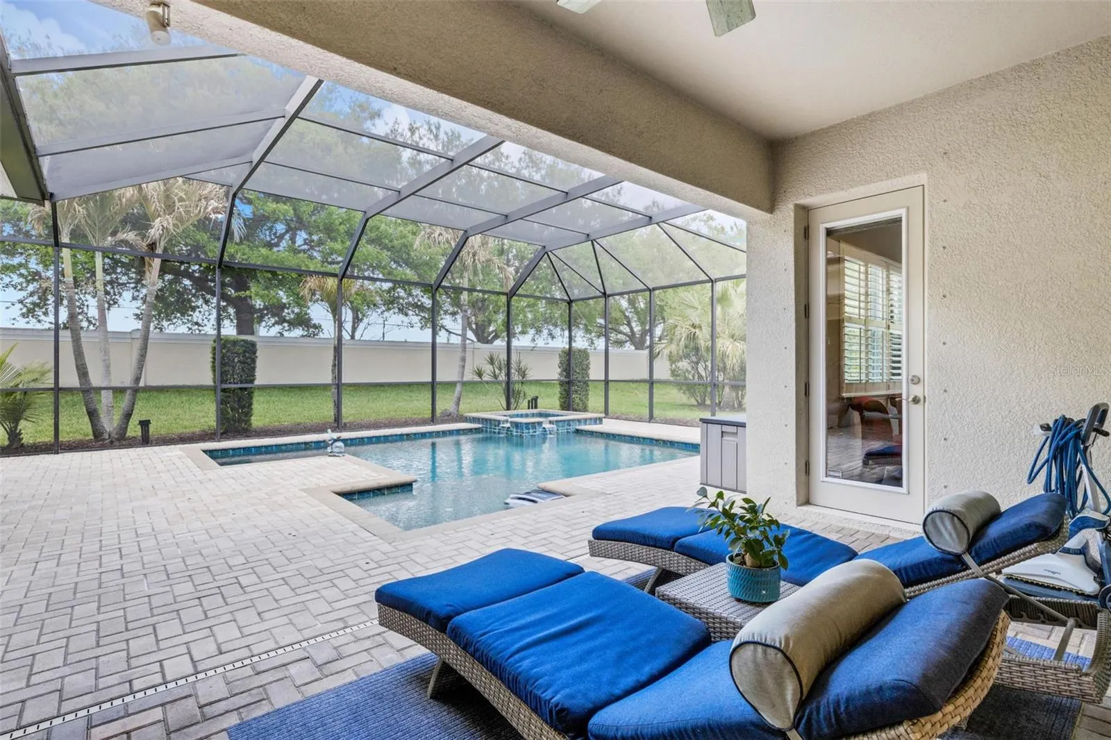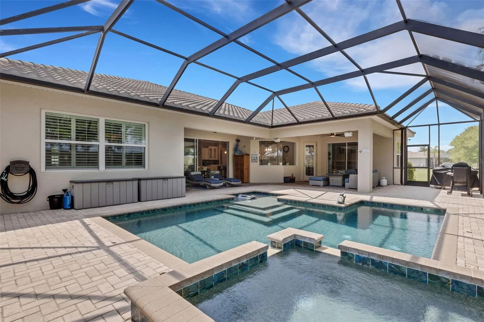 Originally an upgraded builder’s Model Home, conveniently located just inside the premier community of Rye Wilderness , this beautifully appointed 3-bedroom, 3-bath, 3 garage home with a large bonus room sits on a Half-Acre Lot. Upgrades include an impressive stone accent wall, crown molding, tray ceilings, and quartz countertops throughout. The expansive open floor plan offers easy living and effortless entertaining. This is the home where everyone wants to gather, with the living room opening to a large lanai, HEATED SALTWATER POOL and SPA, and multiple seating areas. The split floor plan provides privacy and comfort for the primary suite, which features an en suite bathroom with a garden tub, zero-entry shower, dual sinks, a spacious linen closet, and two John Lewis custom-designed walk-in closets. On the opposite side of the home, you’ll find two additional bedrooms—each with walk-in closets—two bathrooms, and a large bonus room with sliding glass doors to the lanai, perfect for a home office, den, or game room. The current homeowners have added significant value, including a NEW WATER HEATER (2021) & LENNOX 5 TON A/C (2021) WITH MEDICAL GRADE FILTRATION, a whole-house water purification system, wooden plantation shutters, whole house gutter system and Smart Sprinkler System. The roof is cement tile, new in 2014. The three-car garage has been upgraded with new door lifts that recess to the ceiling. These are just some of the features that make this home an exceptional find. Schedule your tour today and pick up the extensive list of all upgrades. With no CDD fees and low HOA fees, this may be the perfect home for you!