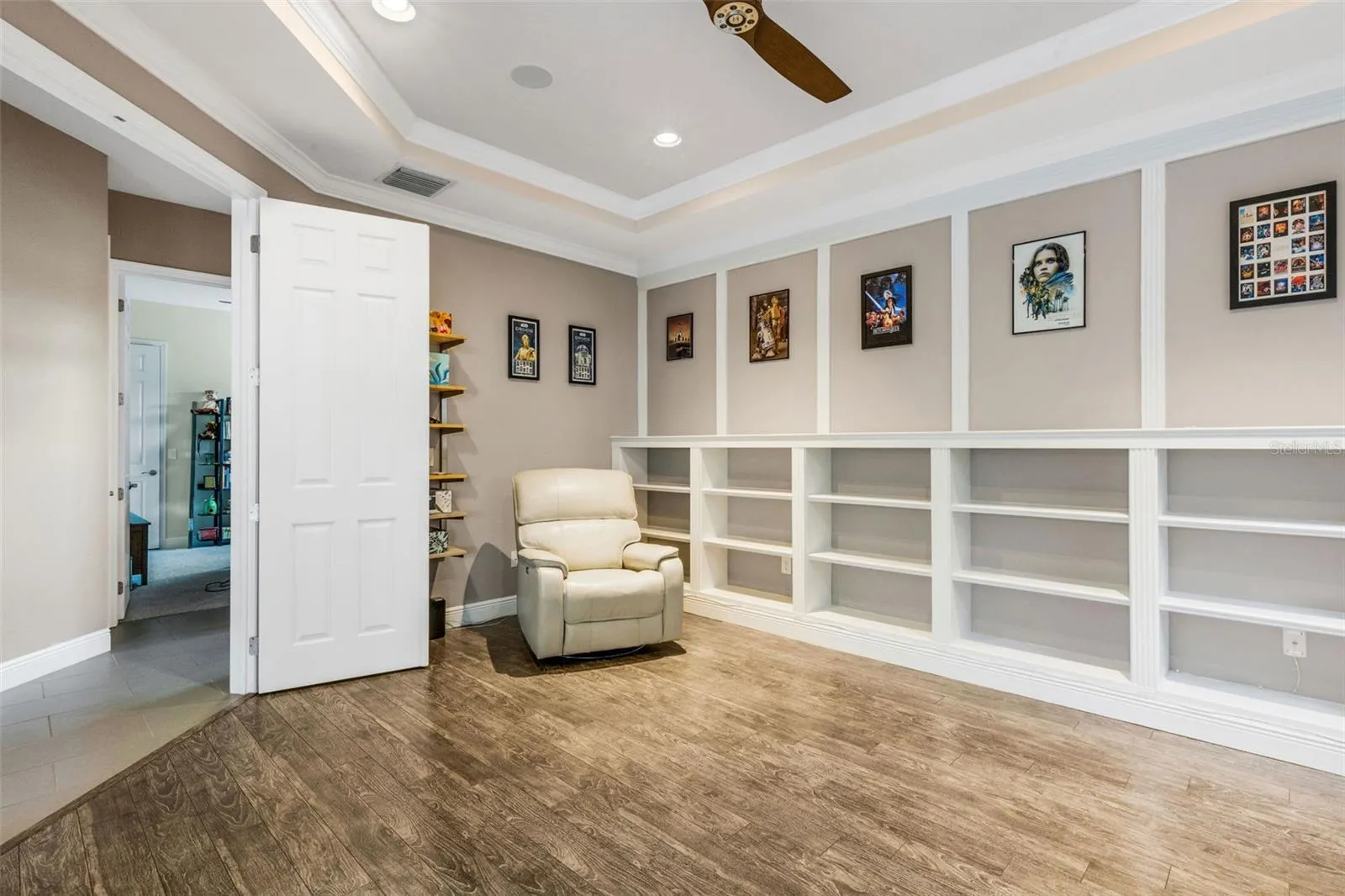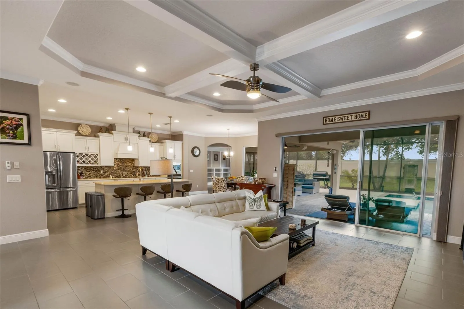 - Ceiling Fans(s), Crown Molding, Open Floorplan, Thermostat, Walk-In Closet(s), Eat-in Kitchen, Kitchen/Family Room Combo, Primary Bedroom Main Floor, Window Treatments, High Ceilings, Stone Counters, Smart Home, Solid Wood Cabinets, Tray Ceiling(s), Built-in Features, L Dining, Coffered Ceiling(s)