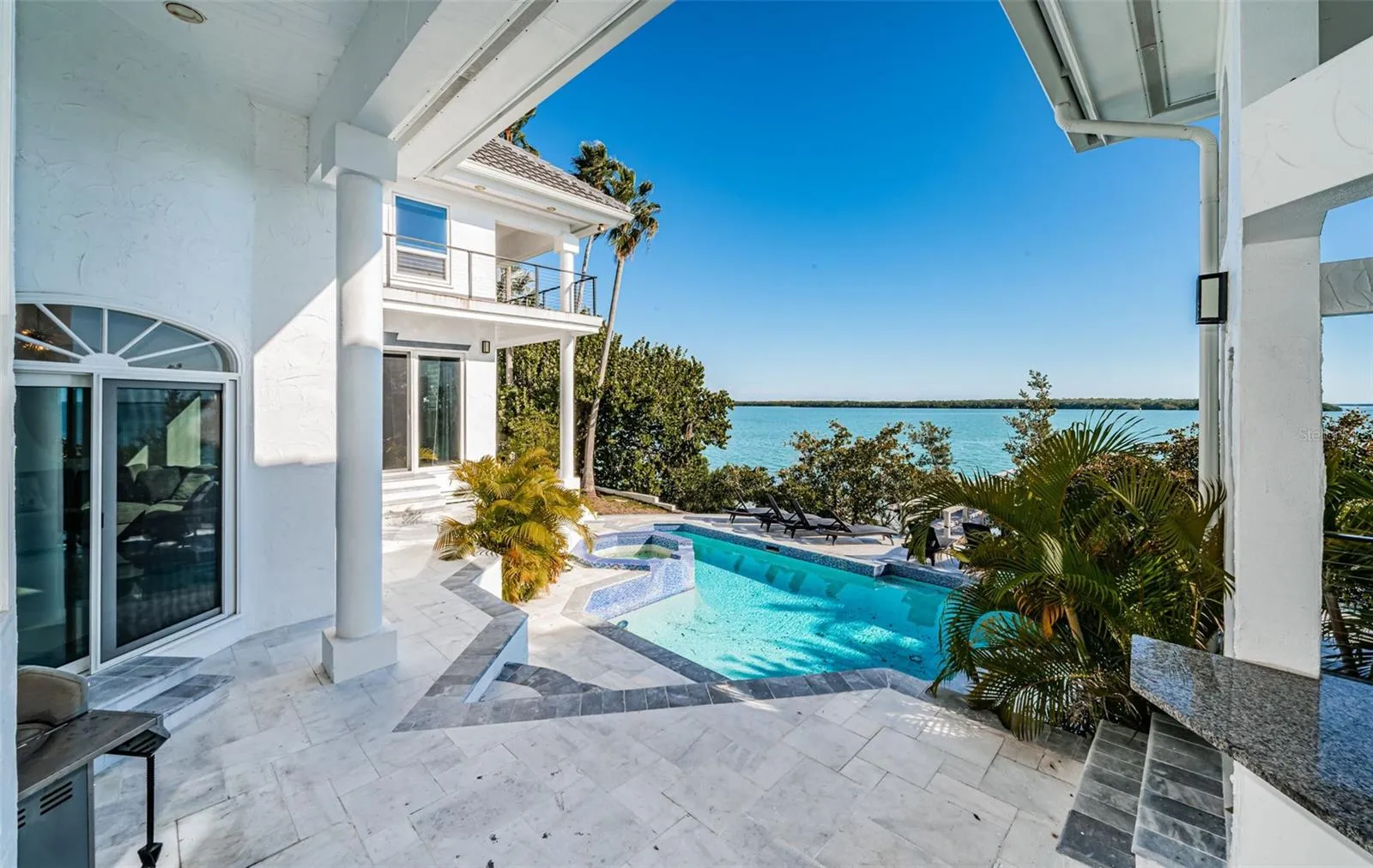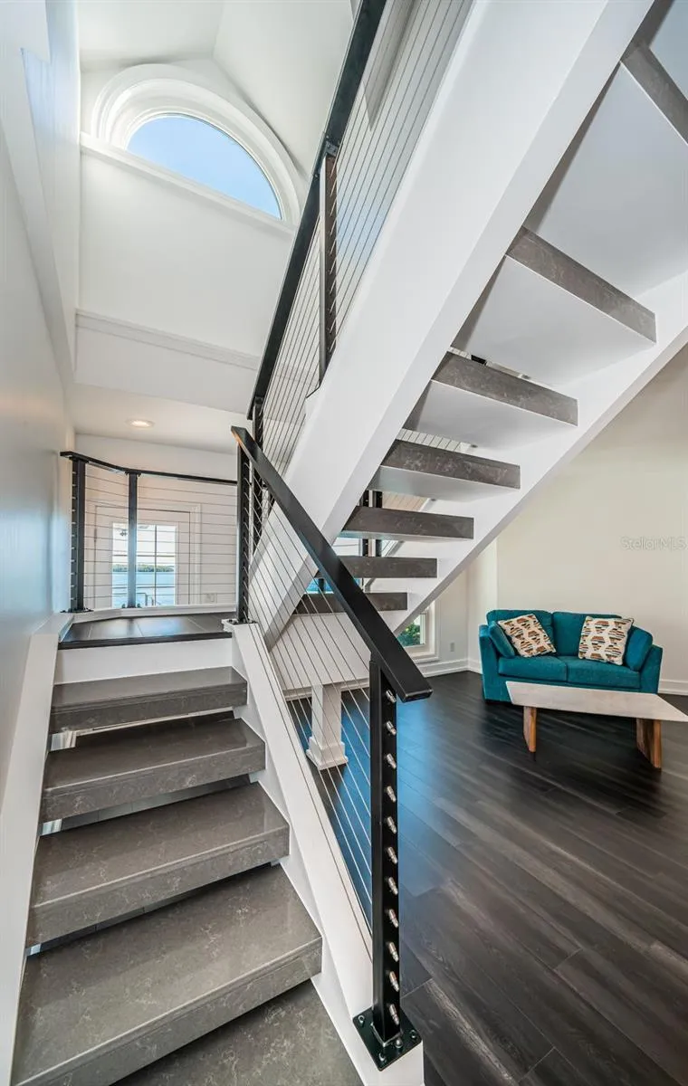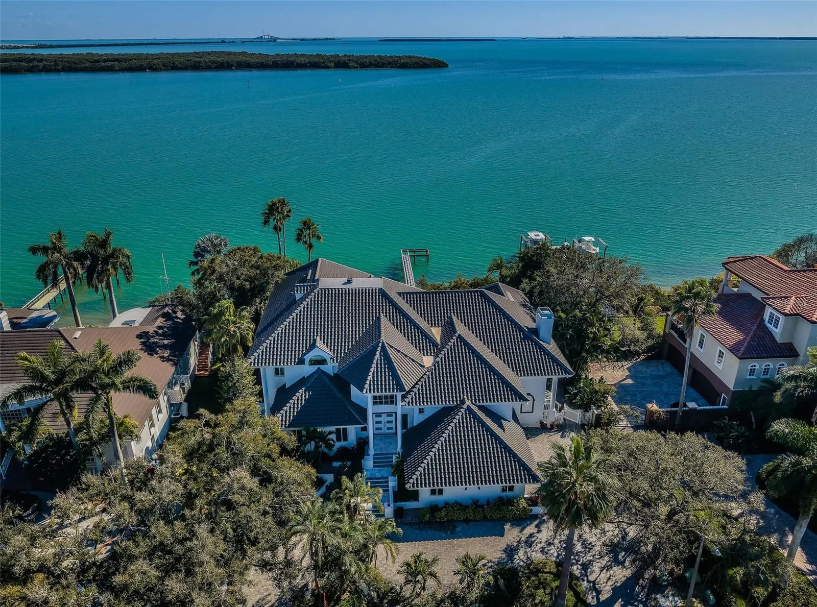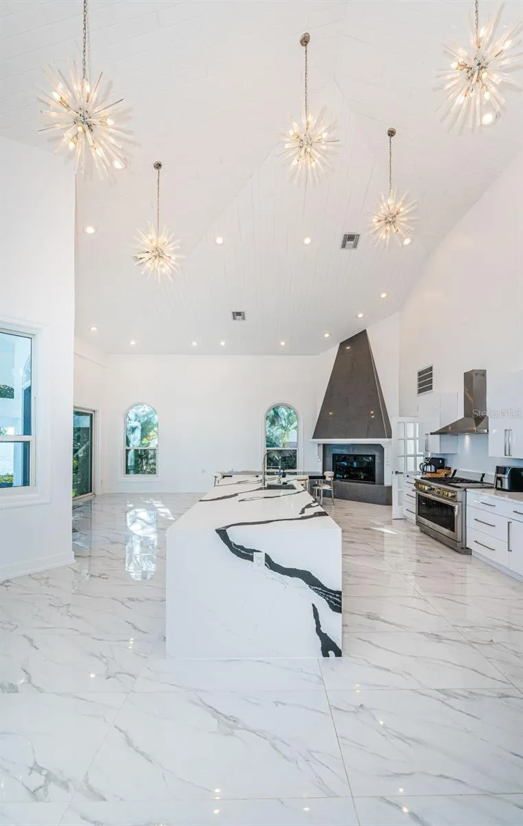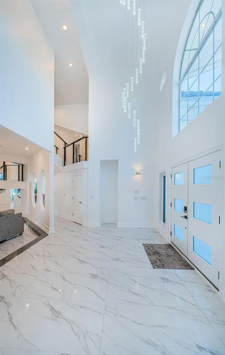 LOCATED IN ONE OF TAMPA BAY’S BEST BOATING COMMUNITIES, THIS DAZZLING 6 BEDROOM 6 ½ BATH WATERFRONT ESTATE PROVIDES AN IMPRESSIVE 6424 SQFT OF LIVING AREA. A grand circular driveway introduces a towering covered entry and a soaring 20ft-high foyer with lovely views of the waterfront. Magnificently remodeled with an inspiring coastal contemporary flare, you will be taken-back by striking large-format porcelain floors and luxury vinyl floors, high ceilings, unique geometric patterns and radiant modern lighting. Overlooking the waterfront, the sumptuous open-concept designer chef’s kitchen boasts 21ft-high ceilings, superb quartz counters, high-end SS appliances, built-in refrigeration, gas cooking, coastal white cabinetry, huge island bar/serving center with quartz waterfall counters, wine chiller and dedicated ice maker. Complementing the kitchen is a matching full appliance/full function butler’s pantry. Gas fireplace with custom mantle transitions to an open waterfront dining area and your back yard oasis. The well-appointed pool bath includes a posh walk-in glass rainshower enclosure. Your exceptional living room has wonderful waterviews and opens to the pool deck. You will appreciate the sizable executive office with fireplace and finely-tiled adjacent guest bath. The huge owner’s suite with expansive walk-in closet, has brilliant views of the intracoastal waterway and private access to the pool deck. The modern owner’s bath is truly stunning – elegant floor-to-ceiling tilework, two minimalistic vanities with quartz surfaces, stand-alone deluxe soaking tub, and an enormous walk-in glass rainshower enclosure with multiple rainshower heads. Isolated to a part of the home with separate exterior access, the spacious guest suite contains three closets and a beautifully-tiled full guest bath. Step up to the upper bedroom level with generously-sized loft overlooking the kitchen and the waterfront. Oversized matching waterfront bedrooms with walk-in closets, are joined by a gorgeous full bath, and share a 28ft-wide covered balcony with commanding views of the water. Two additional bedrooms are supported by a remarkably-luxurious full guest bath with floor-to-ceiling tilework, lavish dual vanities, stand-alone soaking tub, and an exquisite walk-in glass shower enclosure with dual shower systems. The upper-level bonus room – ideal as a game, fitness or media room – also features a splendid full bath. Step out back to the fabulous deck with its richly-tiled swimming pool and spa, and deck space for more than a dozen loungers. Attached to the home is an 18ft-high, 250sqft covered gazebo-like dining and lounging area with terrific views of the waterfront. Outside the owner bedroom is a 28ft-wide covered lounging/seating deck. Beyond the pool deck is the composite dock that walks you out to the open waterway. Home has a newer roof (2023) and a large laundry/utility room, and enjoys tremendous auxiliary storage space and substantial parking. This is an outstanding luxury waterfront value in one of the easiest commuting waterfront locations in all of Tampa Bay. Close to I275 – reach the beaches in 4 min, downtown St. Pete in 10 min, Tampa Airport in 25 min. and Sarasota in 40 minutes. Buyer to verify dimensions.