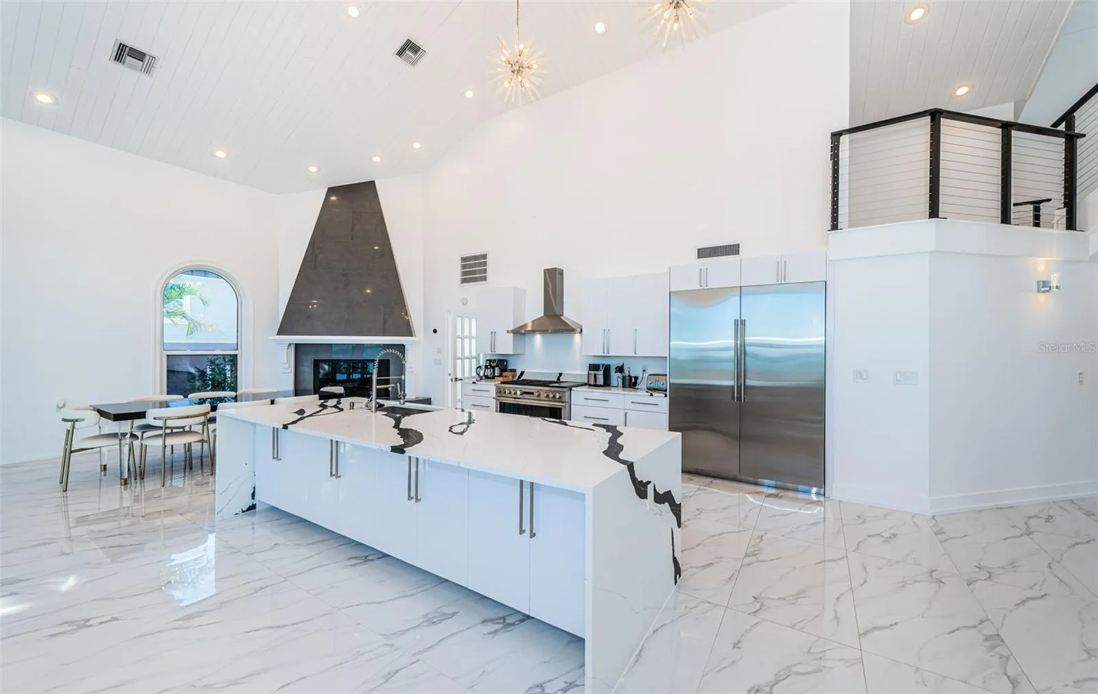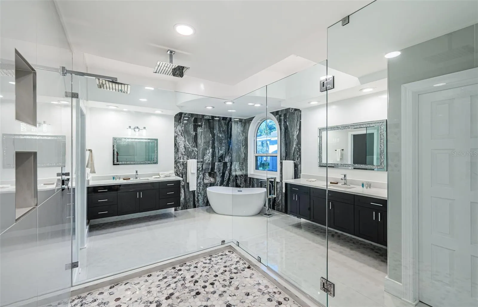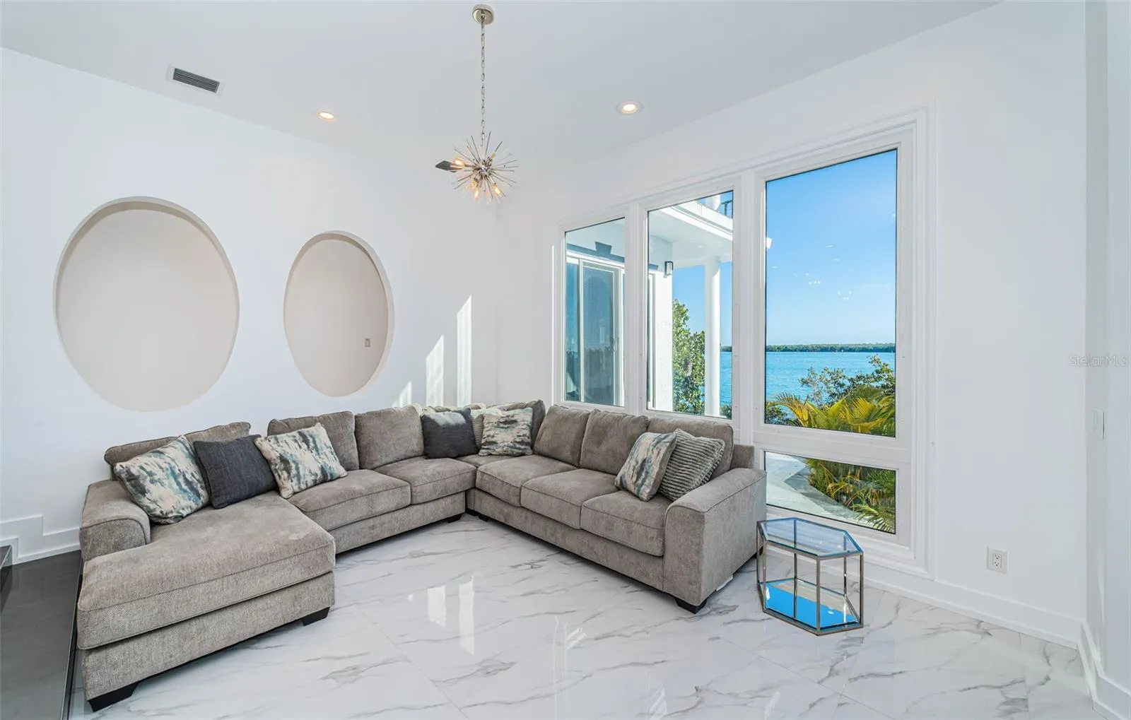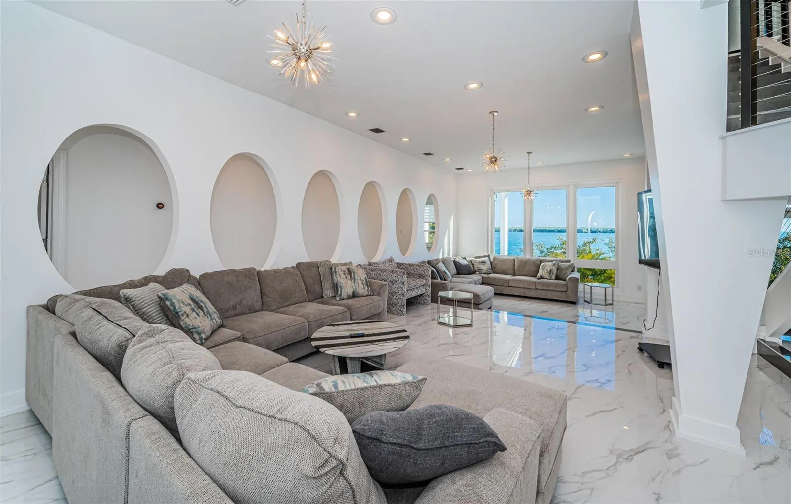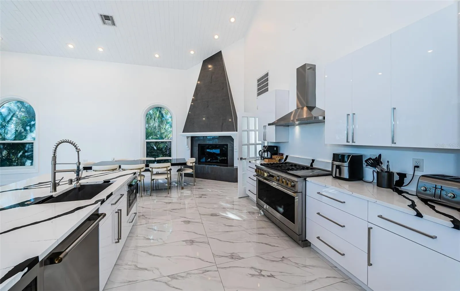 LOCATED IN ONE OF TAMPA BAY’S BEST BOATING COMMUNITIES, THIS DAZZLING 6 BEDROOM 6 ½ BATH WATERFRONT ESTATE PROVIDES AN IMPRESSIVE 6424 SQFT OF LIVING AREA. A grand circular driveway introduces a towering covered entry and a soaring 20ft-high foyer with lovely views of the waterfront. Magnificently remodeled with an inspiring coastal contemporary flare, you will be taken-back by striking large-format porcelain floors and luxury vinyl floors, high ceilings, unique geometric patterns and radiant modern lighting. Overlooking the waterfront, the sumptuous open-concept designer chef’s kitchen boasts 21ft-high ceilings, superb quartz counters, high-end SS appliances, built-in refrigeration, gas cooking, coastal white cabinetry, huge island bar/serving center with quartz waterfall counters, wine chiller and dedicated ice maker. Complementing the kitchen is a matching full appliance/full function butler’s pantry. Gas fireplace with custom mantle transitions to an open waterfront dining area and your back yard oasis. The well-appointed pool bath includes a posh walk-in glass rainshower enclosure. Your exceptional living room has wonderful waterviews and opens to the pool deck. You will appreciate the sizable executive office with fireplace and finely-tiled adjacent guest bath. The huge owner’s suite with expansive walk-in closet, has brilliant views of the intracoastal waterway and private access to the pool deck. The modern owner’s bath is truly stunning – elegant floor-to-ceiling tilework, two minimalistic vanities with quartz surfaces, stand-alone deluxe soaking tub, and an enormous walk-in glass rainshower enclosure with multiple rainshower heads. Isolated to a part of the home with separate exterior access, the spacious guest suite contains three closets and a beautifully-tiled full guest bath. Step up to the upper bedroom level with generously-sized loft overlooking the kitchen and the waterfront. Oversized matching waterfront bedrooms with walk-in closets, are joined by a gorgeous full bath, and share a 28ft-wide covered balcony with commanding views of the water. Two additional bedrooms are supported by a remarkably-luxurious full guest bath with floor-to-ceiling tilework, lavish dual vanities, stand-alone soaking tub, and an exquisite walk-in glass shower enclosure with dual shower systems. The upper-level bonus room – ideal as a game, fitness or media room – also features a splendid full bath. Step out back to the fabulous deck with its richly-tiled swimming pool and spa, and deck space for more than a dozen loungers. Attached to the home is an 18ft-high, 250sqft covered gazebo-like dining and lounging area with terrific views of the waterfront. Outside the owner bedroom is a 28ft-wide covered lounging/seating deck. Beyond the pool deck is the composite dock that walks you out to the open waterway. Home has a newer roof (2023) and a large laundry/utility room, and enjoys tremendous auxiliary storage space and substantial parking. This is an outstanding luxury waterfront value in one of the easiest commuting waterfront locations in all of Tampa Bay. Close to I275 – reach the beaches in 4 min, downtown St. Pete in 10 min, Tampa Airport in 25 min. and Sarasota in 40 minutes. Buyer to verify dimensions.