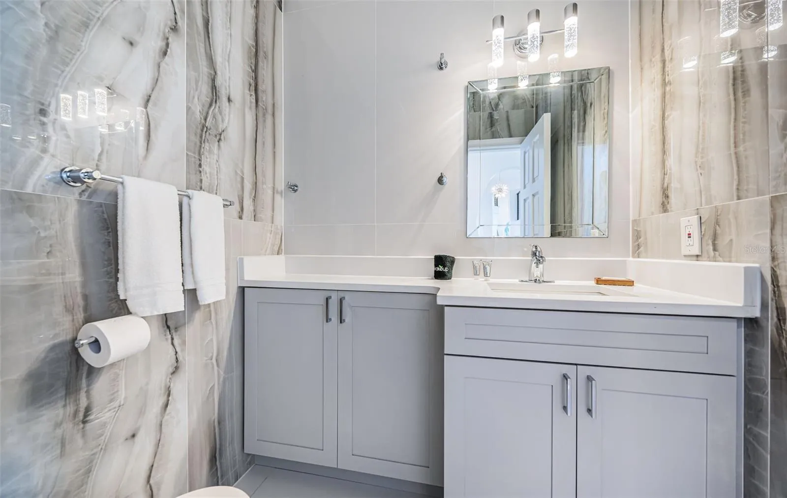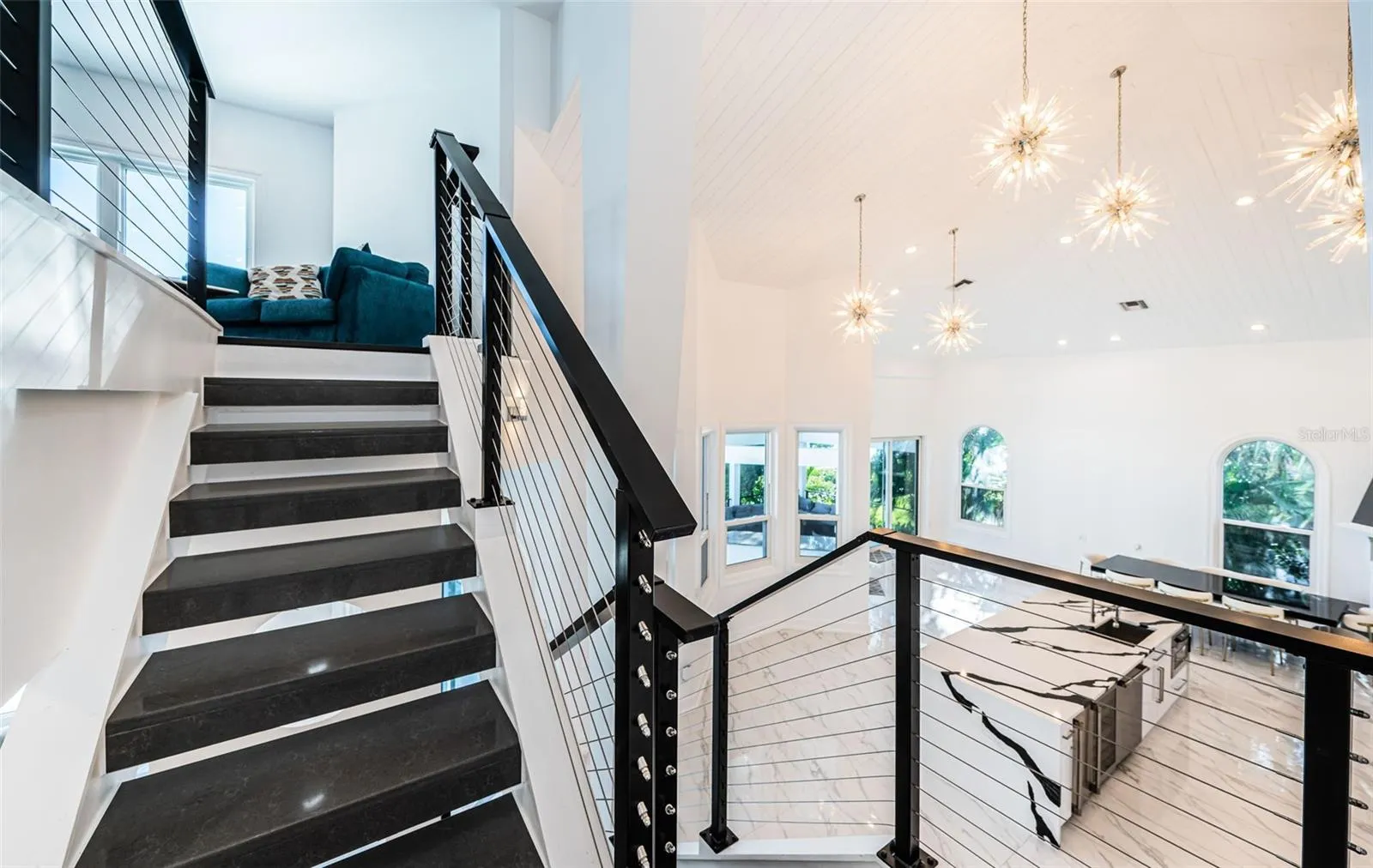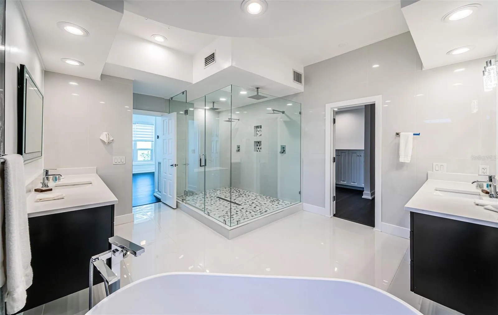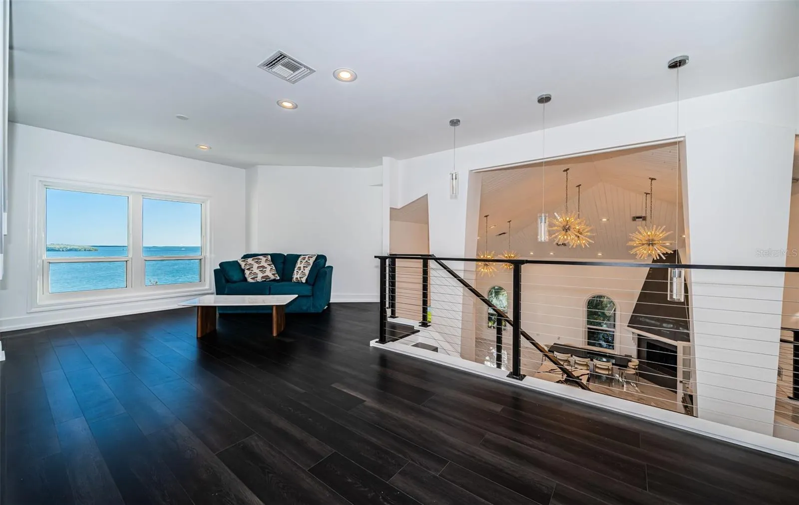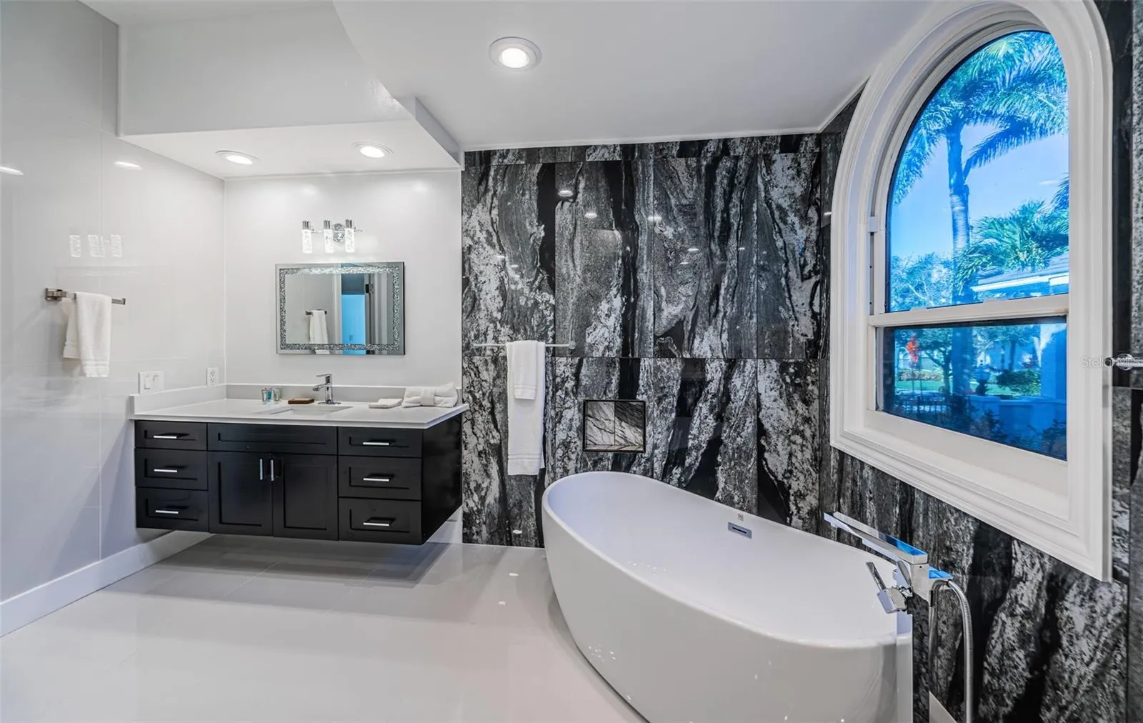 LOCATED IN ONE OF TAMPA BAY’S BEST BOATING COMMUNITIES, THIS DAZZLING 6 BEDROOM 6 ½ BATH WATERFRONT ESTATE PROVIDES AN IMPRESSIVE 6424 SQFT OF LIVING AREA. A grand circular driveway introduces a towering covered entry and a soaring 20ft-high foyer with lovely views of the waterfront. Magnificently remodeled with an inspiring coastal contemporary flare, you will be taken-back by striking large-format porcelain floors and luxury vinyl floors, high ceilings, unique geometric patterns and radiant modern lighting. Overlooking the waterfront, the sumptuous open-concept designer chef’s kitchen boasts 21ft-high ceilings, superb quartz counters, high-end SS appliances, built-in refrigeration, gas cooking, coastal white cabinetry, huge island bar/serving center with quartz waterfall counters, wine chiller and dedicated ice maker. Complementing the kitchen is a matching full appliance/full function butler’s pantry. Gas fireplace with custom mantle transitions to an open waterfront dining area and your back yard oasis. The well-appointed pool bath includes a posh walk-in glass rainshower enclosure. Your exceptional living room has wonderful waterviews and opens to the pool deck. You will appreciate the sizable executive office with fireplace and finely-tiled adjacent guest bath. The huge owner’s suite with expansive walk-in closet, has brilliant views of the intracoastal waterway and private access to the pool deck. The modern owner’s bath is truly stunning – elegant floor-to-ceiling tilework, two minimalistic vanities with quartz surfaces, stand-alone deluxe soaking tub, and an enormous walk-in glass rainshower enclosure with multiple rainshower heads. Isolated to a part of the home with separate exterior access, the spacious guest suite contains three closets and a beautifully-tiled full guest bath. Step up to the upper bedroom level with generously-sized loft overlooking the kitchen and the waterfront. Oversized matching waterfront bedrooms with walk-in closets, are joined by a gorgeous full bath, and share a 28ft-wide covered balcony with commanding views of the water. Two additional bedrooms are supported by a remarkably-luxurious full guest bath with floor-to-ceiling tilework, lavish dual vanities, stand-alone soaking tub, and an exquisite walk-in glass shower enclosure with dual shower systems. The upper-level bonus room – ideal as a game, fitness or media room – also features a splendid full bath. Step out back to the fabulous deck with its richly-tiled swimming pool and spa, and deck space for more than a dozen loungers. Attached to the home is an 18ft-high, 250sqft covered gazebo-like dining and lounging area with terrific views of the waterfront. Outside the owner bedroom is a 28ft-wide covered lounging/seating deck. Beyond the pool deck is the composite dock that walks you out to the open waterway. Home has a newer roof (2023) and a large laundry/utility room, and enjoys tremendous auxiliary storage space and substantial parking. This is an outstanding luxury waterfront value in one of the easiest commuting waterfront locations in all of Tampa Bay. Close to I275 – reach the beaches in 4 min, downtown St. Pete in 10 min, Tampa Airport in 25 min. and Sarasota in 40 minutes. Buyer to verify dimensions.