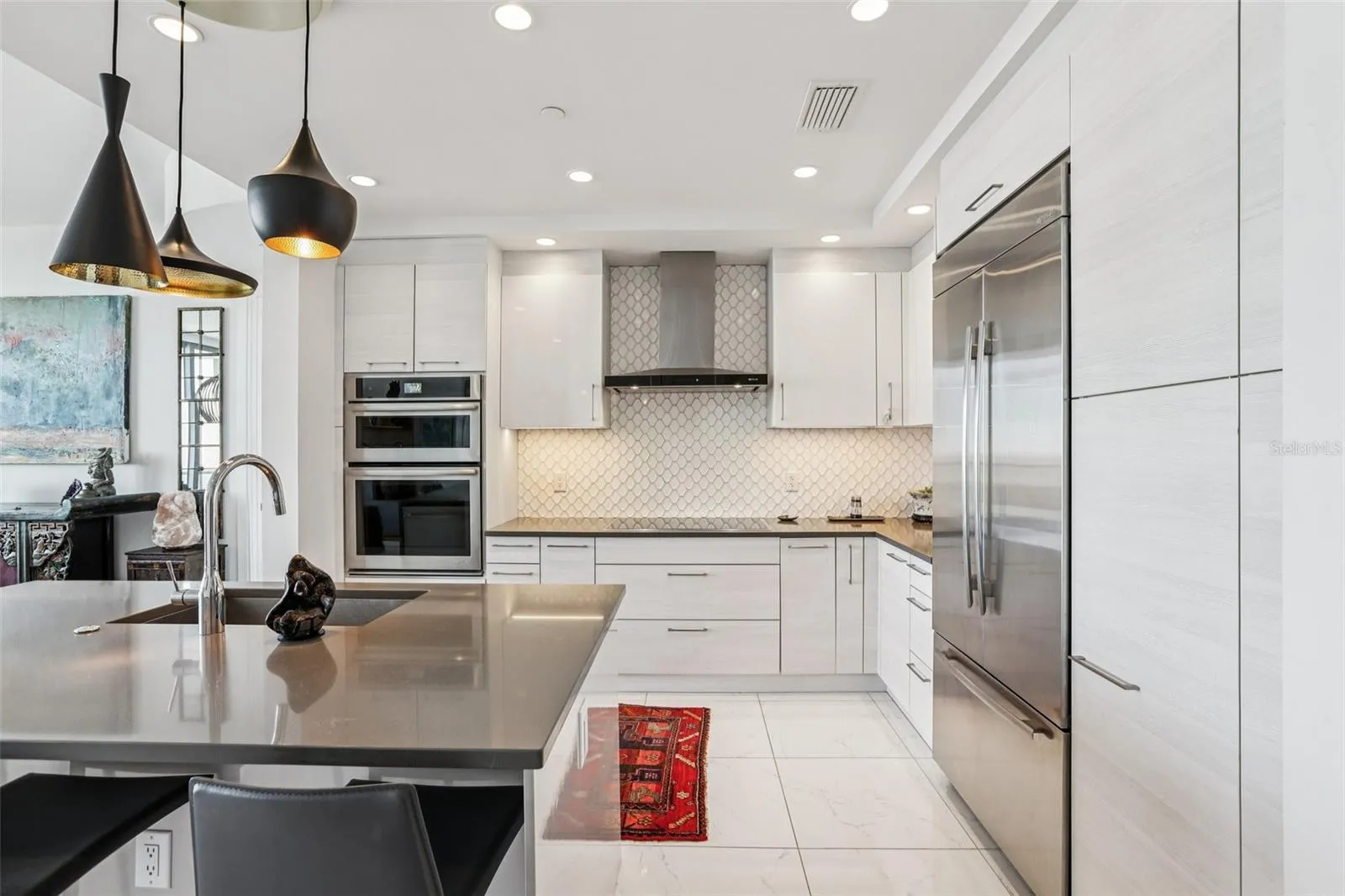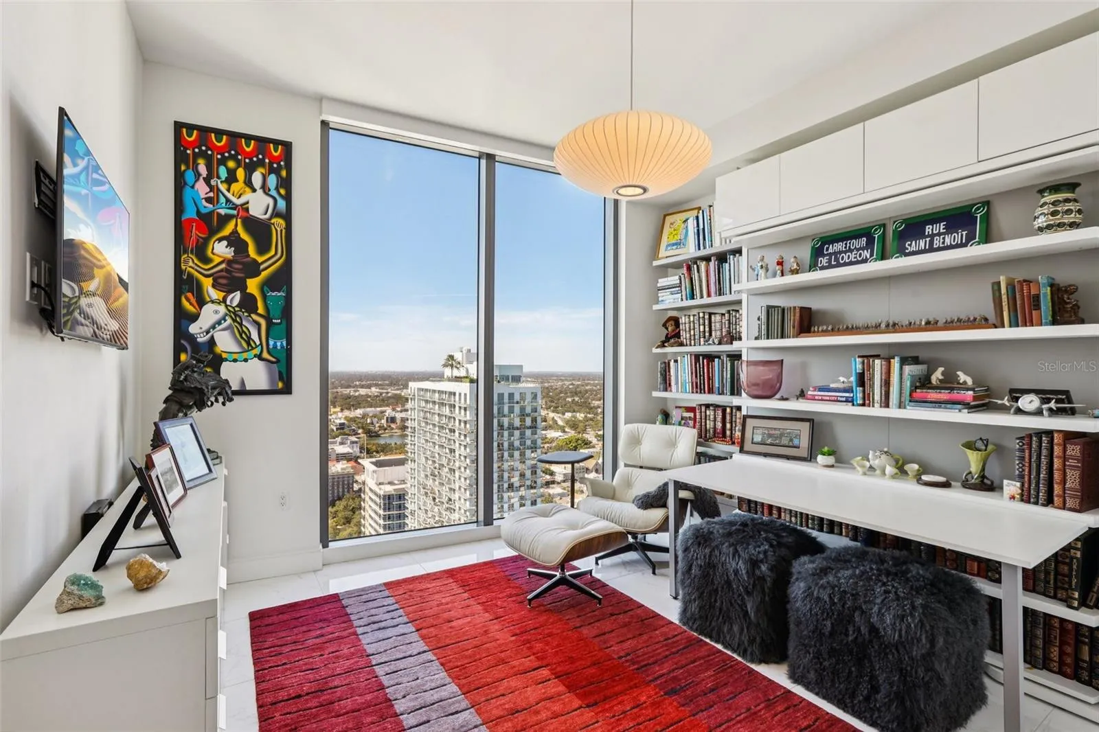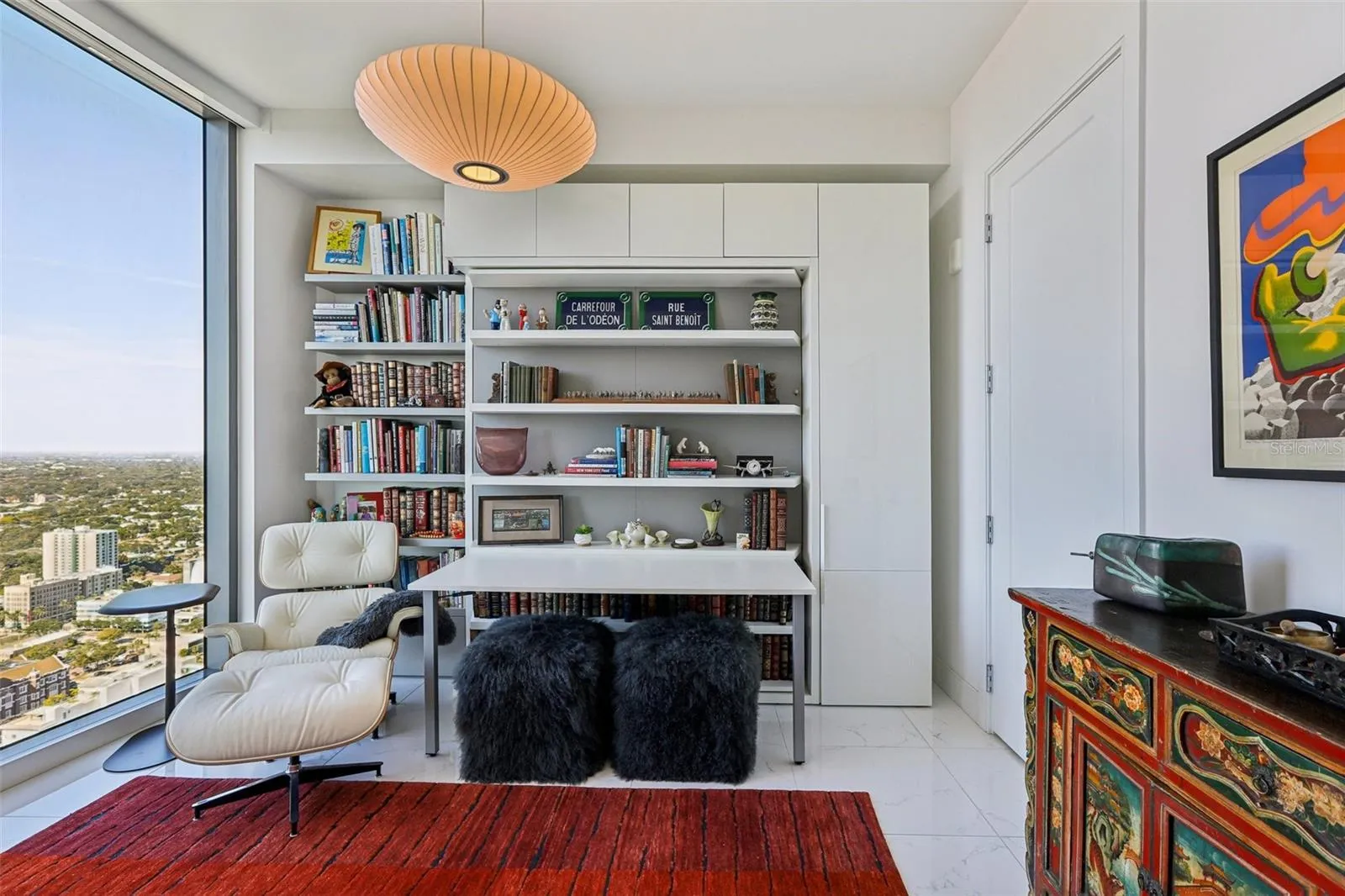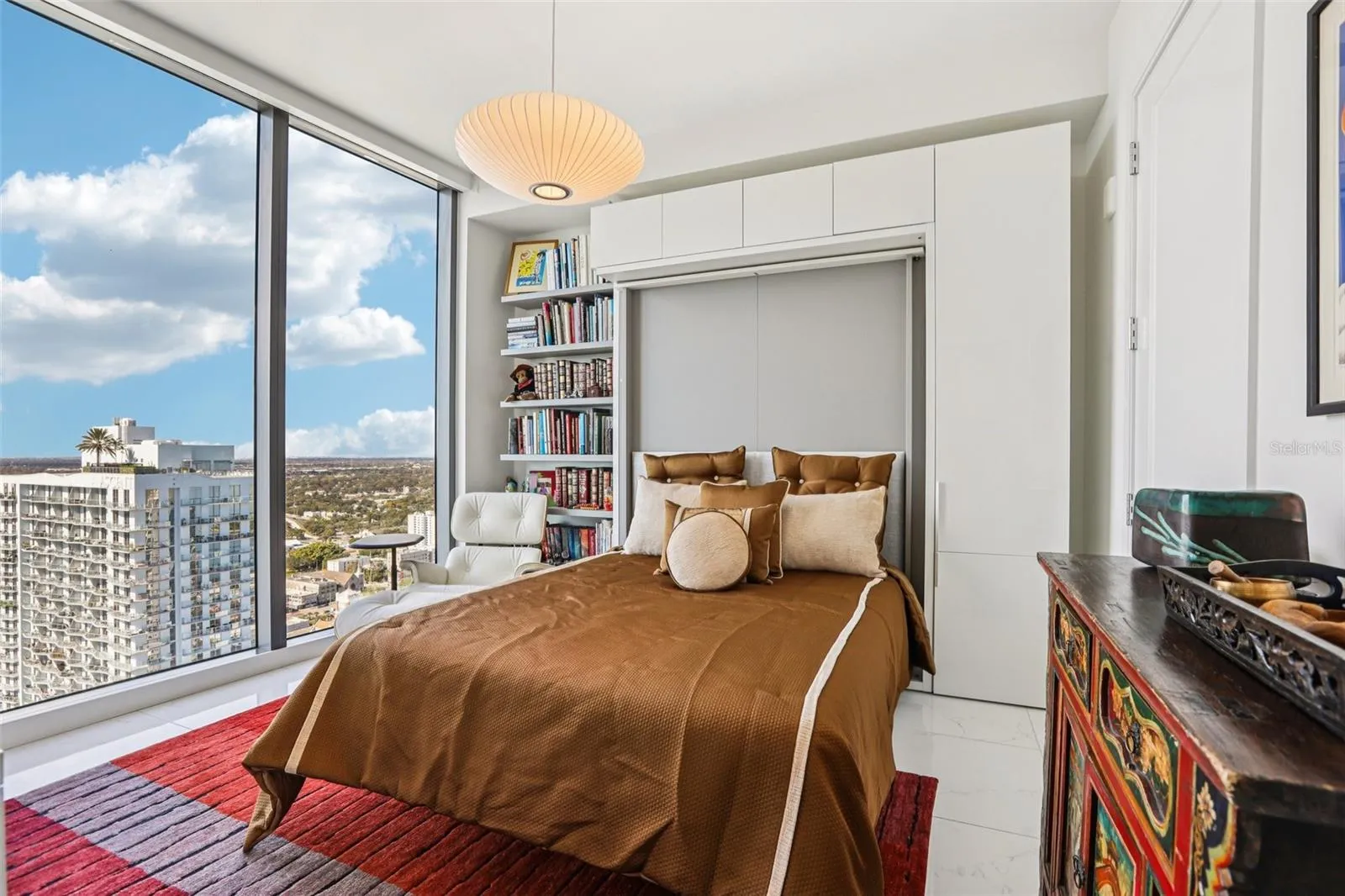 Perched on the 38th floor, this sophisticated residence offers a masterclass in modern high-rise living, defined by endless western views of the Gulf of Mexico and cityscape. Beyond the 10′ ceilings and floor-to-ceiling glass, the home has been transformed by intentional upgrades, including Nuvo Calacatta Gris porcelain flooring and contemporary designer lighting.