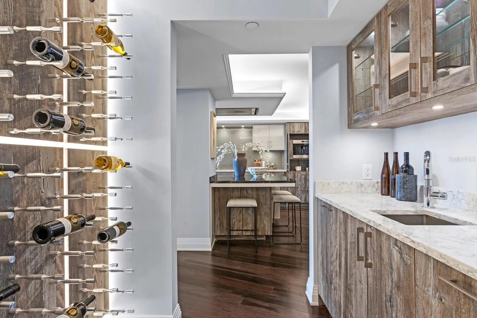 - Elevator, Walk-In Closet(s), Eat-in Kitchen, Window Treatments, Stone Counters, Solid Wood Cabinets, Solid Surface Counters, Tray Ceiling(s), Wet Bar, Built-in Features, Accessibility Features, Coffered Ceiling(s)