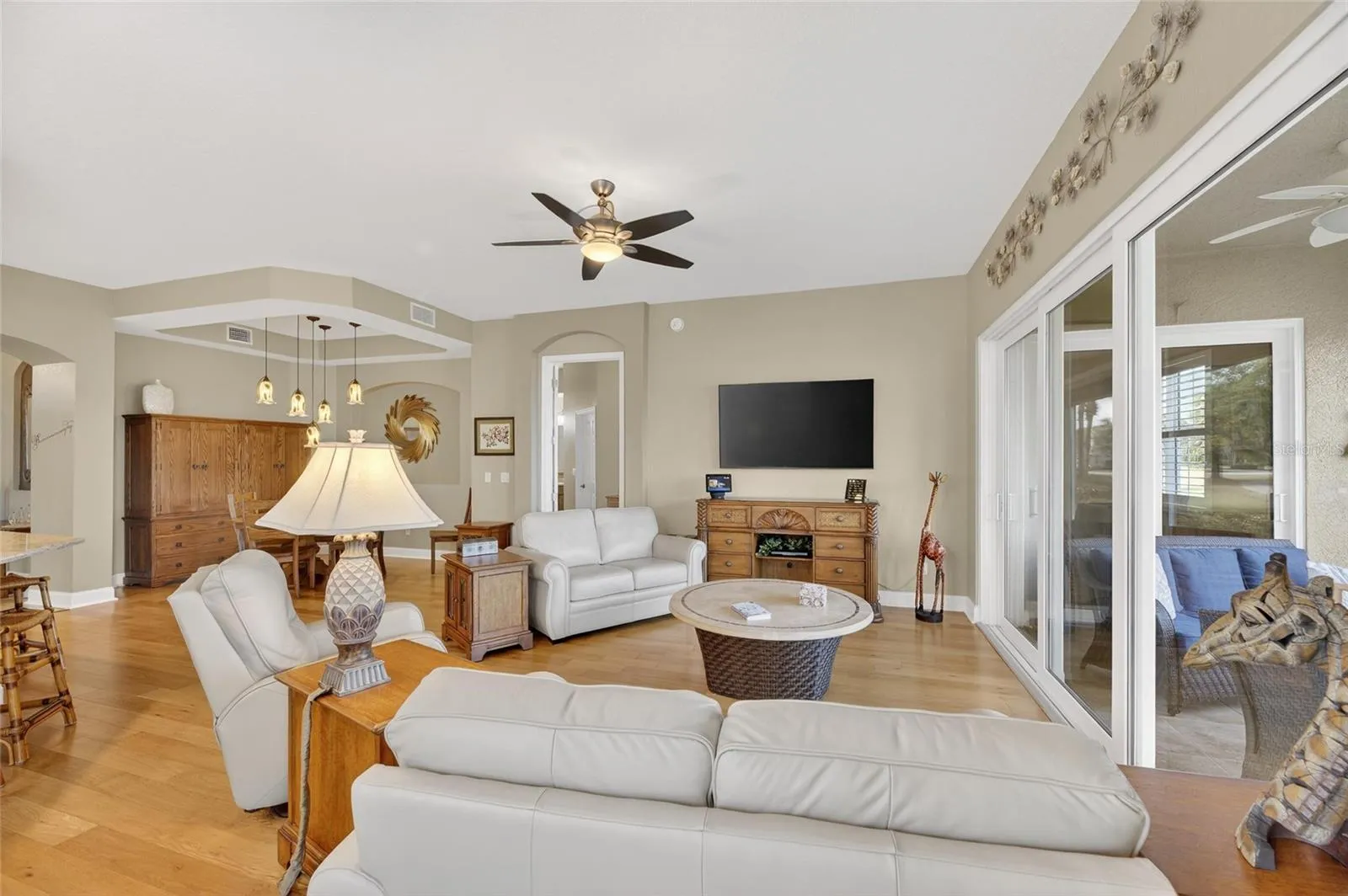 The open-concept layout flows effortlessly into the spacious living and dining areas, creating a welcoming environment for gatherings.