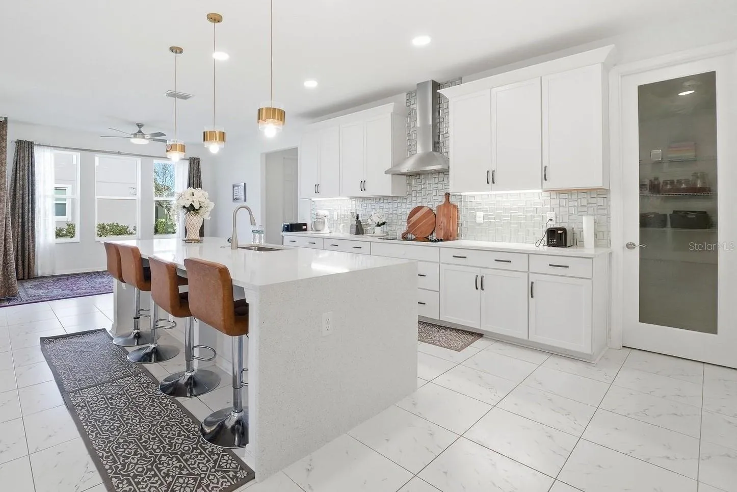 The café, just off the kitchen, is a wonderful place to start the day. The open kitchen overlooks both the café and the family room and boasts a full walk-in pantry with modern cabinets, quartz countertops and stainless-steel appliances.