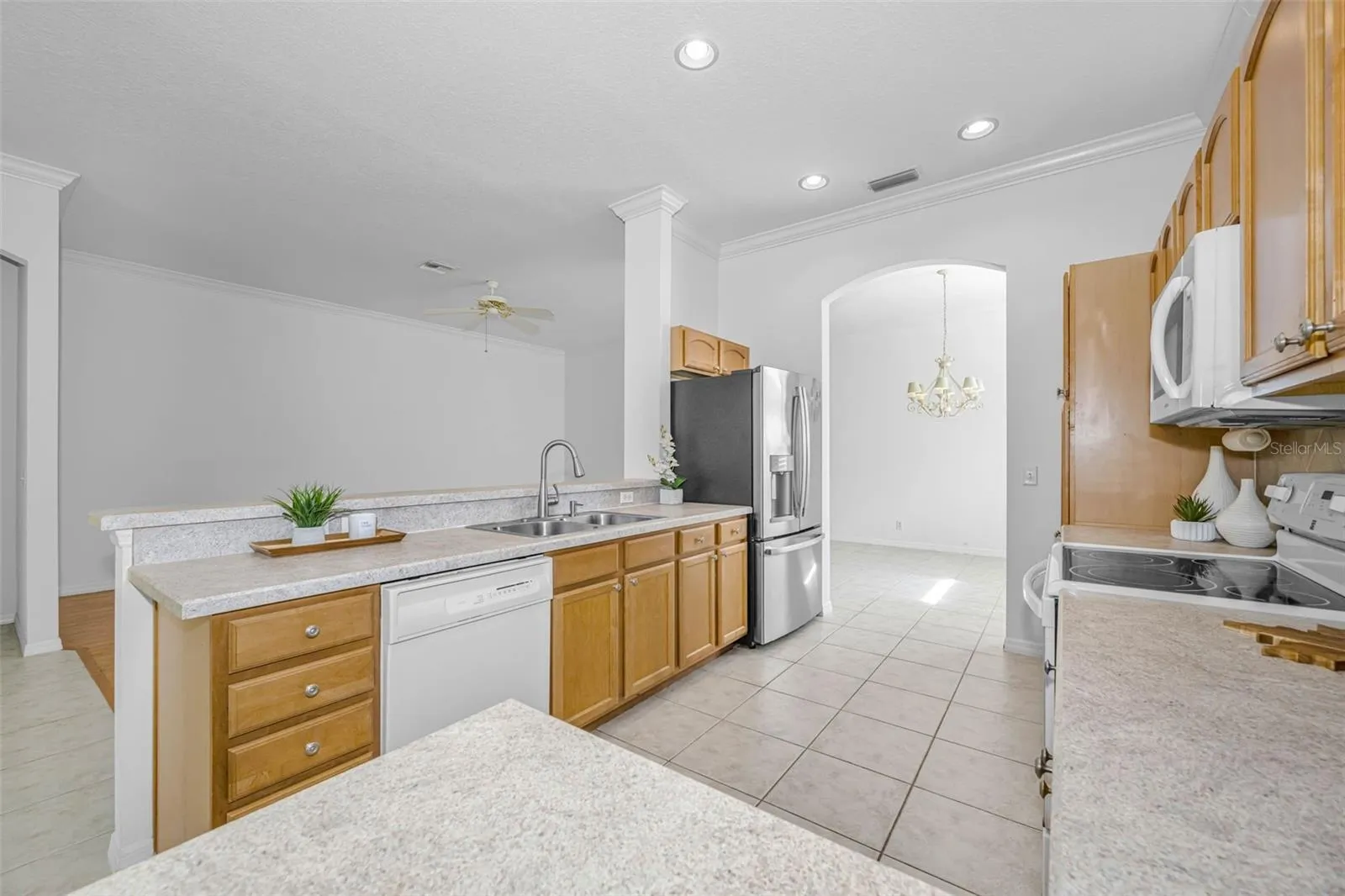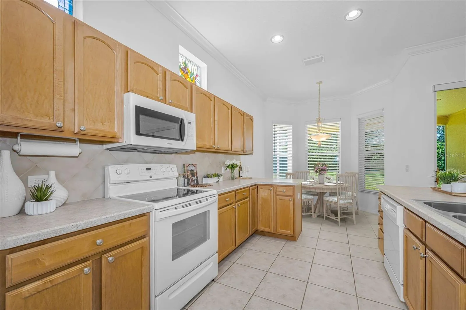 Step inside to an open floor plan with a separate dining area and a spacious great room, perfect for entertaining. The kitchen features tile flooring, a tile backsplash, abundant cabinet and counter space, a breakfast bar, and a cozy eat-in nook. Crown molding throughout the living, dining, and kitchen areas adds an elegant touch.
