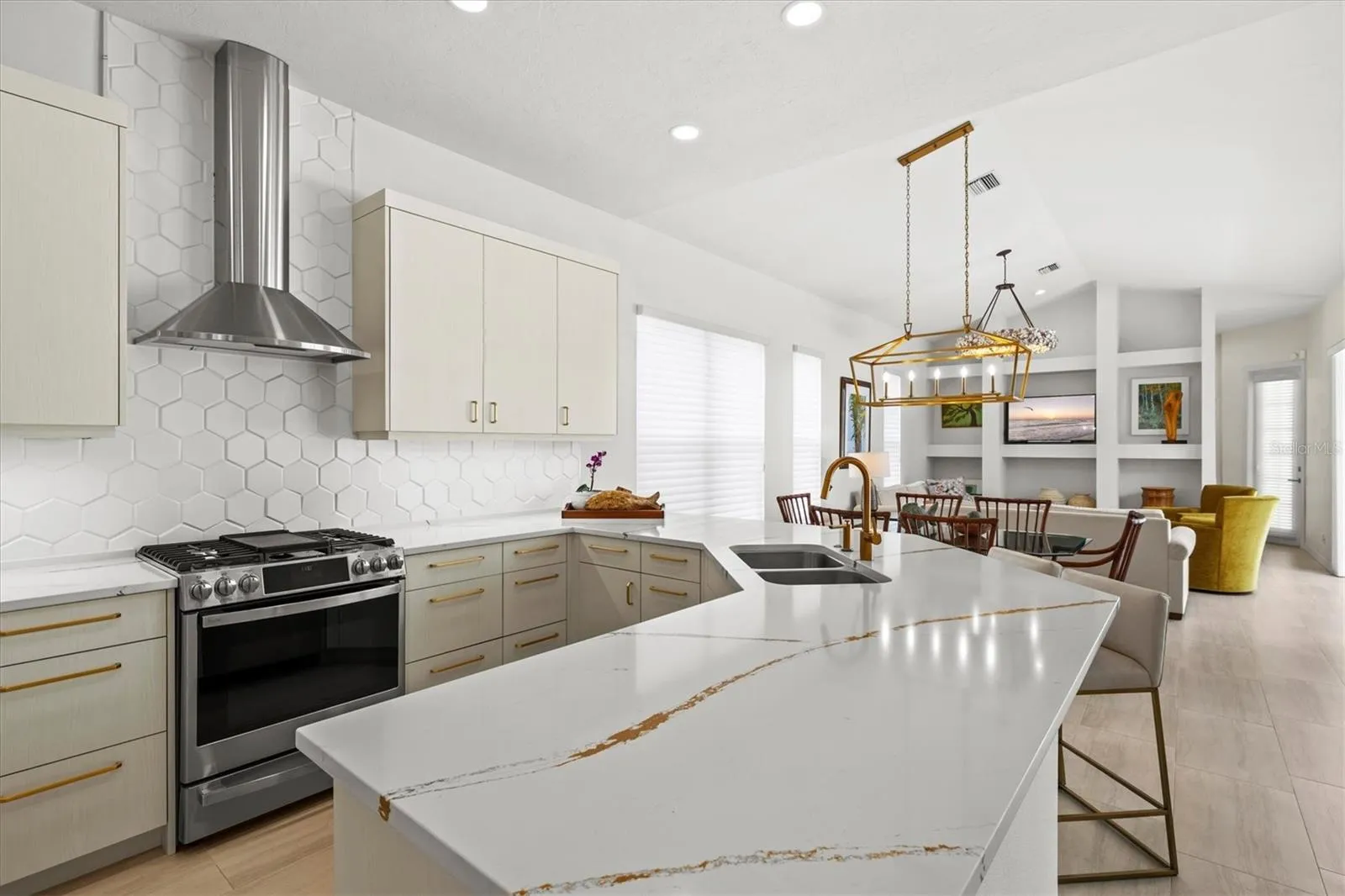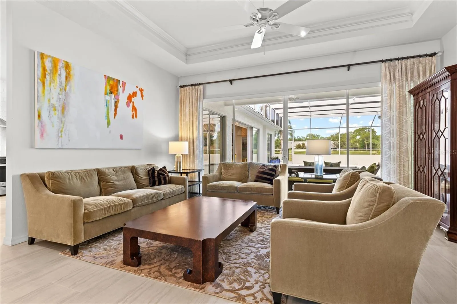 Welcome home to Wilton Crescent, an amenity-rich community tucked behind the gates of University Park Country Club. Perfectly positioned on nearly ¼ acre along the 14th hole, this completely renovated 3 bedroom, 3 bathroom residence offers over 2,500 square feet of thoughtfully redesigned living space with stunning golf course views. From the moment you arrive, the paver driveway, lush tropical landscaping, and impressive curb appeal set the tone. Inside, you’re welcomed by porcelain tile flooring, soaring ceilings, tray ceiling details, and a light-filled layout designed for seamless indoor/outdoor living. The spacious living room is framed by a wall of sliding glass doors opening to the lanai and pool, while the beautifully updated kitchen features quartz countertops, a large center island, panel refrigerator, stainless steel double built-in ovens, natural gas range with vent hood, and designer finishes throughout.