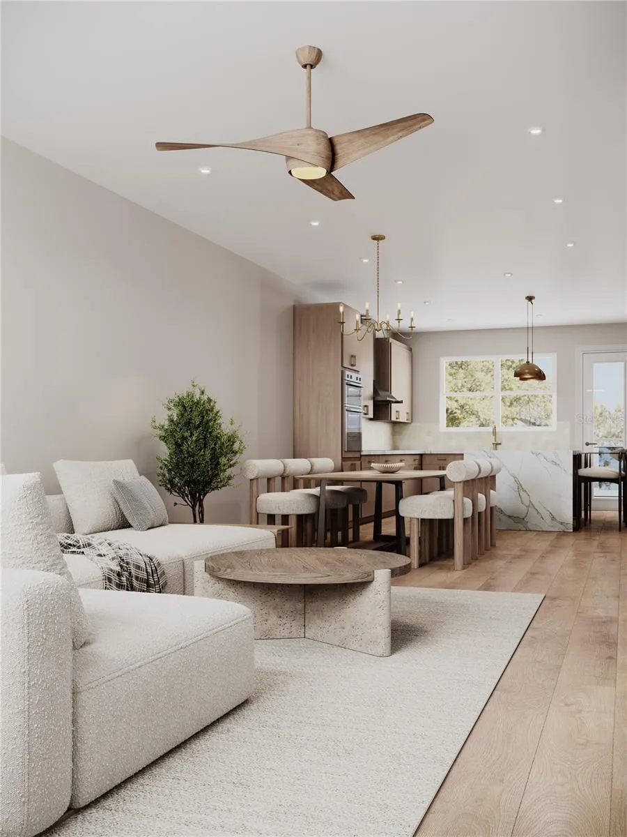 At the heart of the home is a show-stopping designer kitchen crafted for both everyday living and upscale entertaining, showcasing custom flat-panel wood cabinetry extending floor to ceiling, premium stone countertops, and a dramatic oversized waterfall-edge island with generous seating. The kitchen is equipped with built-in appliances, including a wall oven, sleek cooktop with custom vent hood, panel-ready refrigerator, and built-in wine refrigerator, delivering a seamless, high-end aesthetic. Thoughtfully integrated open wood shelving, designer brass pendant lighting, and layered recessed lighting elevate the space, while wide-plank flooring and large windows flood the home with natural light and create an effortless flow into the open living and dining areas.
