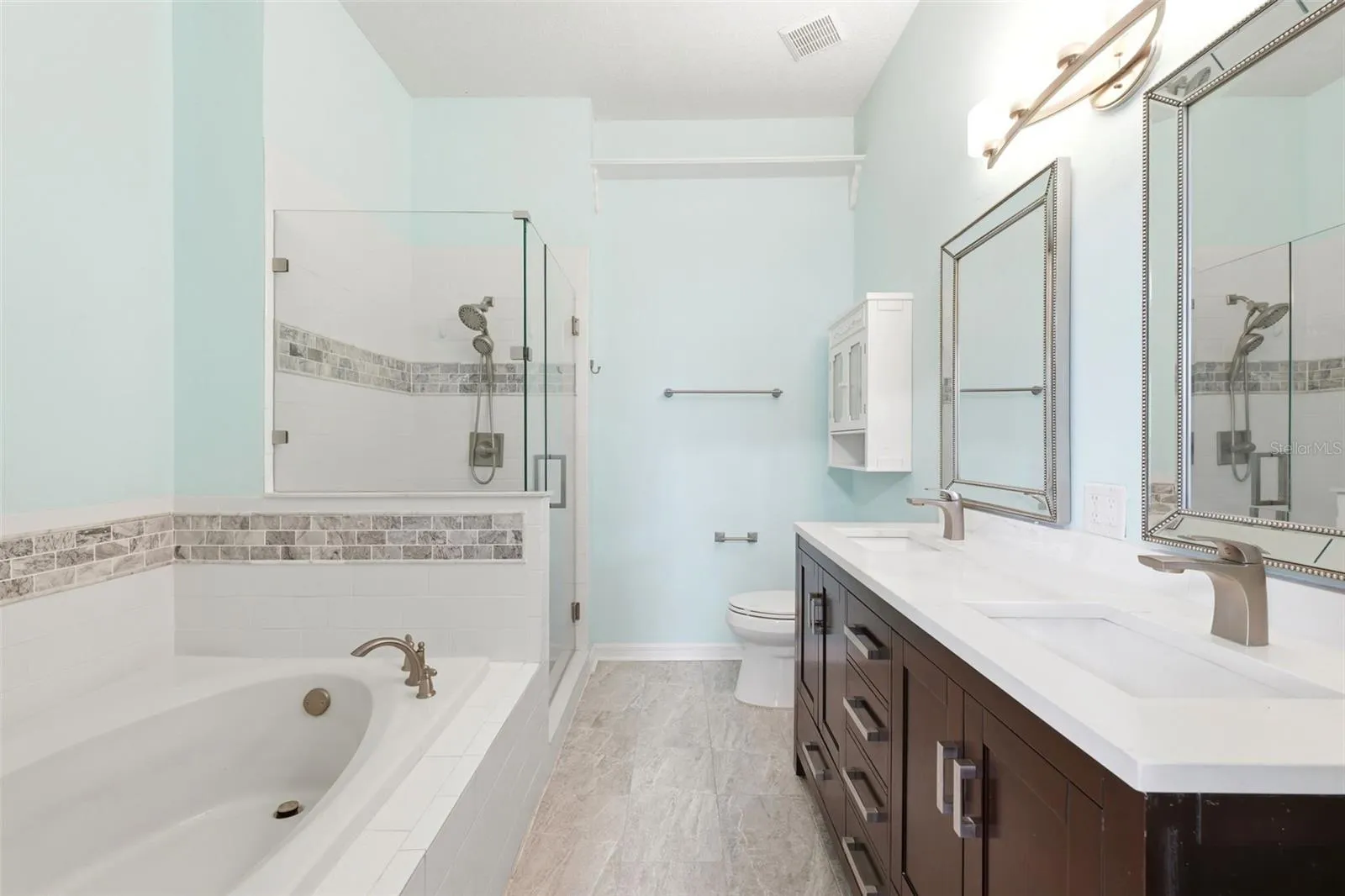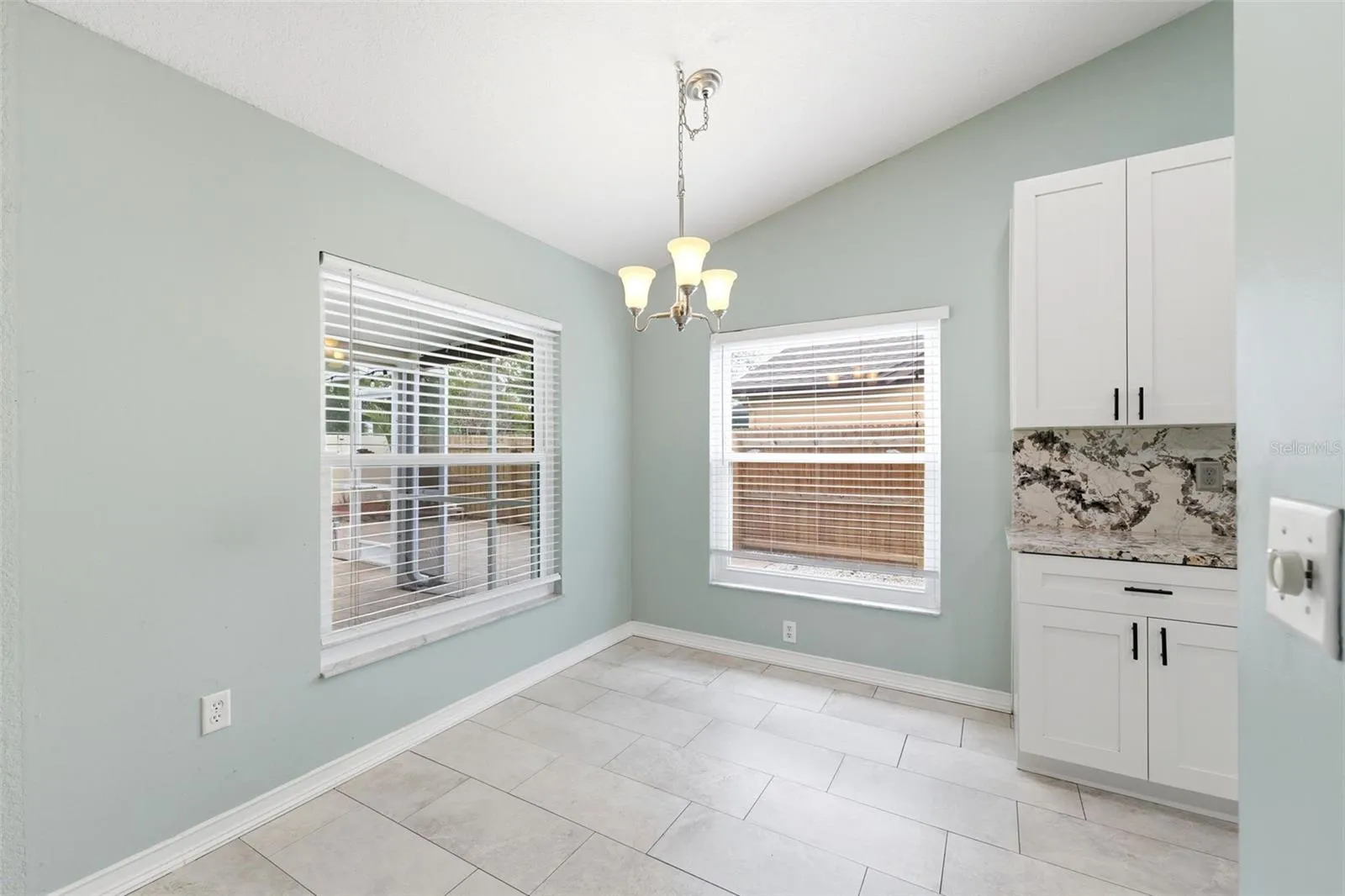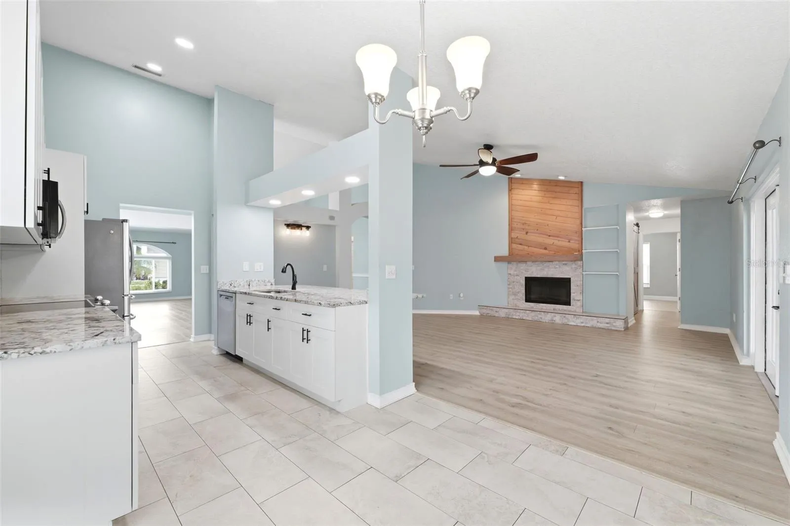 Recently updated and thoughtfully upgraded, this 3-bedroom, 2-bath home with a 2-car garage, home office, and additional family room offers a spacious and inviting layout paired with a true Florida outdoor lifestyle. Major improvements include a roof replaced in 2023, windows in 2021, HVAC in 2019, and water heater in 2020, along with all new flooring throughout featuring luxury vinyl plank in the main living areas and tile in the kitchen and bathrooms. As you arrive, the extra-wide driveway provides ample parking and sets the tone for the generous space found throughout the home. Step inside to a large living and dining room combination with soaring cathedral ceilings and an open, airy feel. Just beyond, the expansive family room creates a warm and inviting gathering space centered around a wood-burning fireplace with stone accents, while French doors lead directly to the outdoor living area. The remodeled kitchen is beautifully appointed with solid wood soft-close cabinetry, granite countertops with a matching backsplash, stainless steel appliances, a double sink, and is perfectly connected to both the breakfast nook and family room. The secondary bathroom has been completely updated with white cabinetry, stone counters, dual vanities with black hardware accents, and a stunning step-in shower with frameless glass, built-in shelving, and a bench, along with direct access to the pool—ideal as a true pool bath. The primary suite offers a unique and spacious layout, complete with an ensuite bathroom, walk-in closet, and a private office space, while the bathroom features dual vanities with stone counters, solid wood cabinetry, decorative mirrors, built-in shelving, a soaking tub, and a separate step-in shower. Additional features include new interior doors, an indoor laundry room, and a dedicated home office with a built-in closet for flexibility. Outdoor living truly shines with a fully screened, solar-heated pool connected to an expansive covered lanai with a new roof, pavered flooring, and French door access, along with an extended paver patio, a wooden pergola, and a fenced backyard that offers both privacy and space to entertain. Located in a community with a low annual HOA, residents enjoy access to amenities including tennis courts, softball and soccer fields, volleyball and basketball courts, two dog parks, a playground, picnic pavilion, and more, creating a lifestyle that blends comfort, recreation, and convenience.