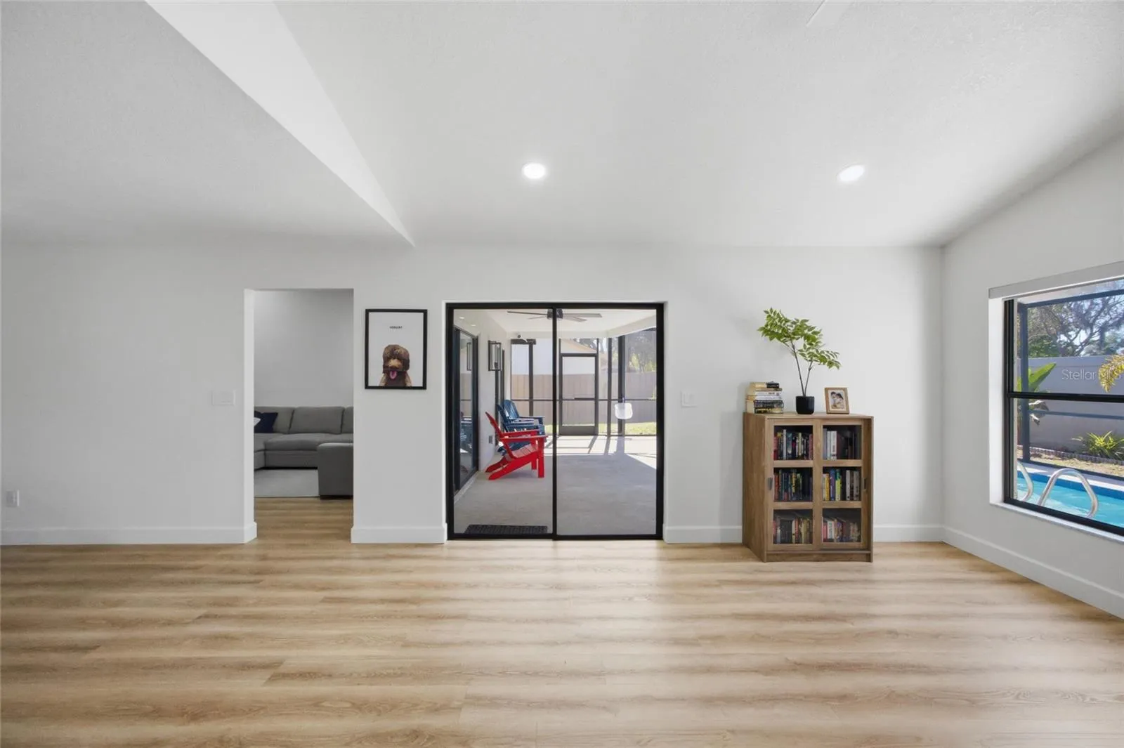 Upon entry, you’re greeted by a formal living and dining room that opens seamlessly to the pool area through sliding glass doors—perfect for indoor-outdoor living. The split floor plan offers privacy, with the spacious primary suite situated on the left side of the home, featuring direct pool access, a walk-in closet, dual sinks, a separate water closet, and a modern walk-in shower with Carrara marble tile.