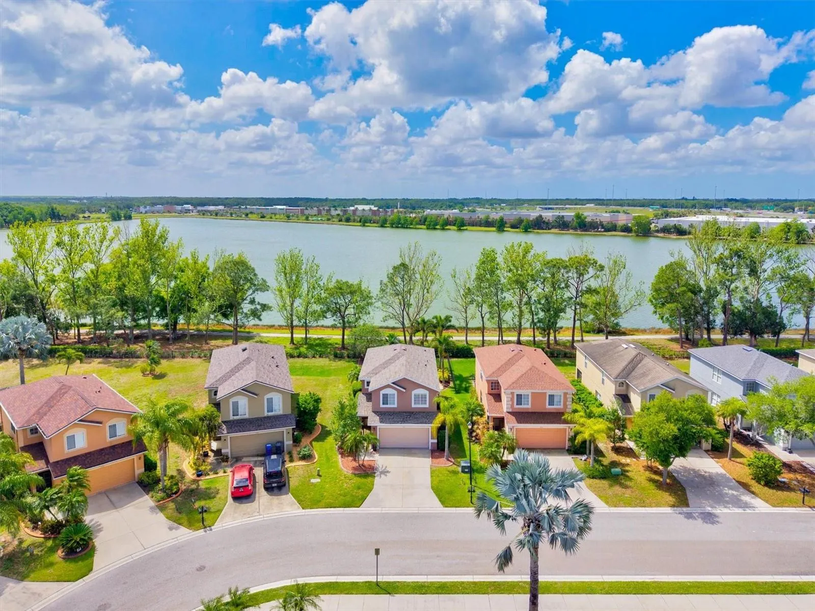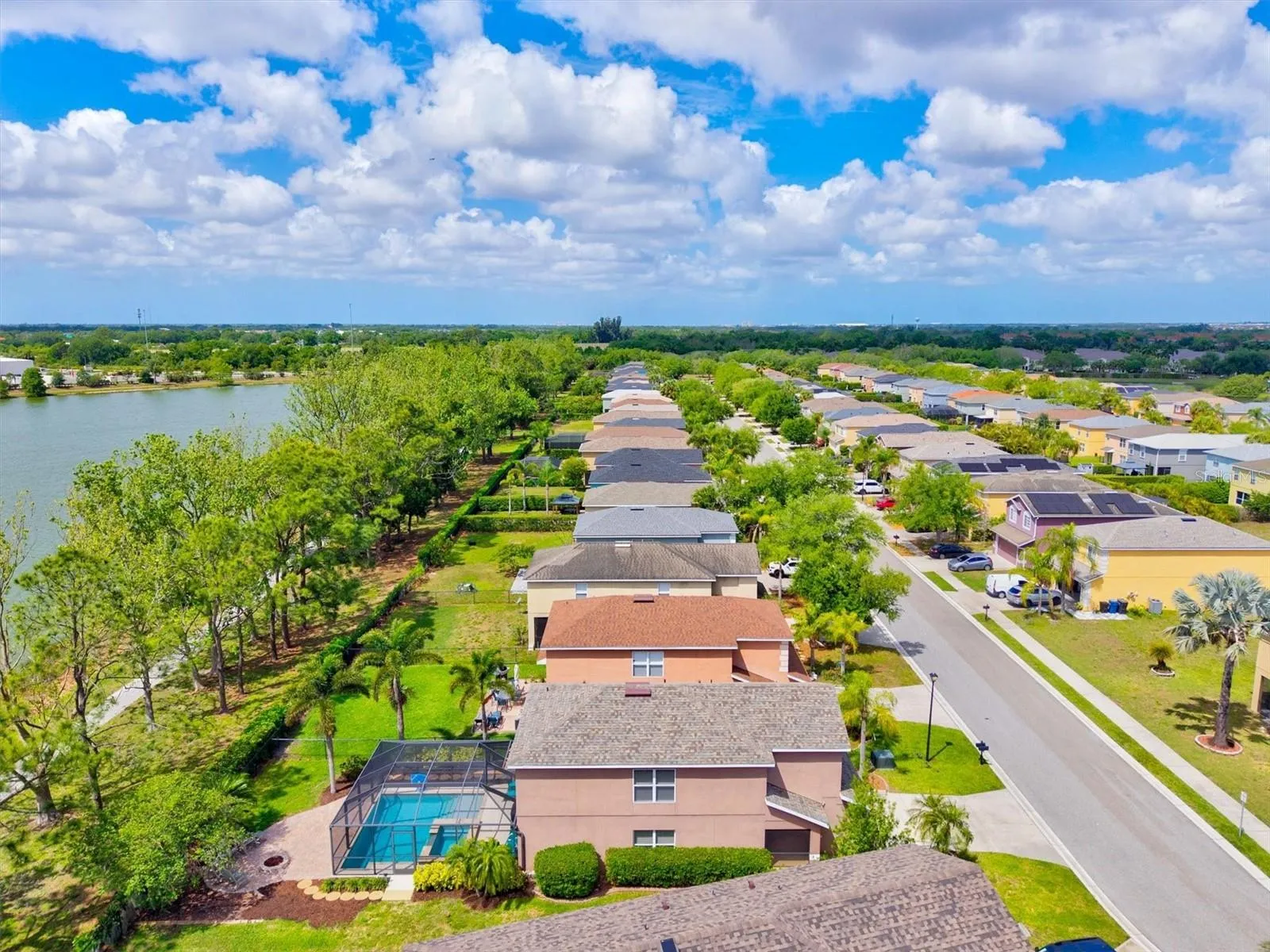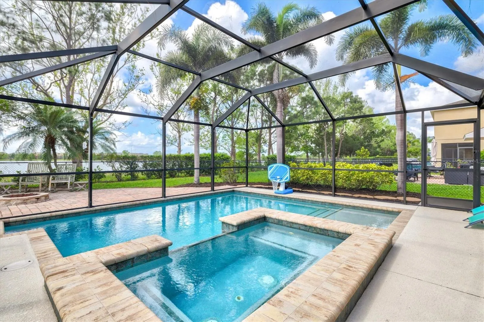 Welcome to this beautifully maintained, move-in ready home in desirable Lighthouse Cove at Heritage Harbour, perfectly positioned on a premium lot with serene lake views and no direct rear neighbors. This spacious 3-bedroom, 2.5-bath home with a versatile loft offers a bright, open-concept layout ideal for everyday living and entertaining. The main level features a sun-filled great room that flows seamlessly into the dining area and kitchen, complete with ample cabinetry, generous counter space, and a breakfast bar. A stylish brick accent wall adds warmth and character. Upstairs, the flexible loft provides space for a home office, media room, or play area. The primary suite offers a private retreat with dual vanities, soaking tub, separate walk-in shower, and a large walk-in closet, along with an updated shower for a fresh, modern feel. Secondary bedrooms are well-sized and comfortable. Step outside to your private backyard oasis featuring a screened-in pool and spa installed in 2019, a covered lanai for outdoor lounging, and an expansive paver patio with fire pit and grill, both connected to a dedicated gas line, perfect for entertaining or relaxing. Enjoy peaceful lake views and a scenic walking path just beyond the backyard, ideal for morning strolls or evening sunsets. Additional updates include a newer A/C (2023) and roof (2024), offering peace of mind for years to come. Located in an amenity-rich community with parks, playgrounds, walking trails, and golf nearby. Convenient to I-75, SR-64, shopping, dining, and more. A rare opportunity to own a home with exceptional outdoor living and water views. Schedule your showing today.