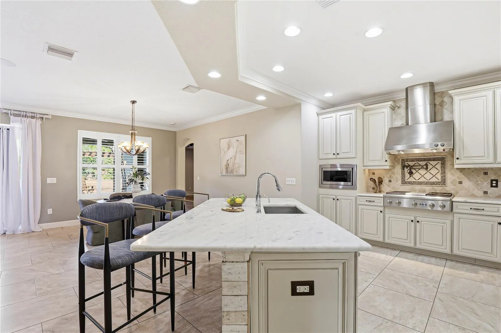 overlooks it all, making hosting effortless. It offers a central island with breakfast bar seating, a