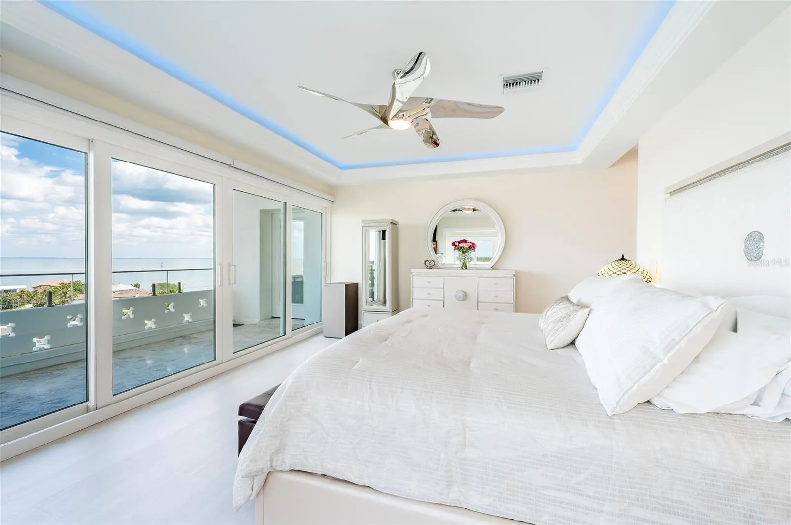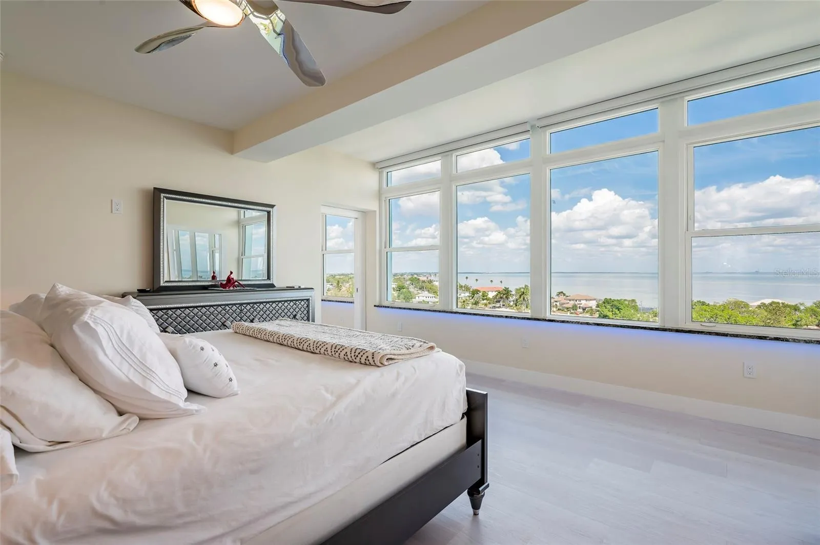 The layout seamlessly blends open living areas with private retreats, all framed by breathtaking panoramic views of Tampa Bay, including the iconic St. Pete Pier, stretching from the Sunshine Skyway Bridge to the skyline of Downtown Tampa.