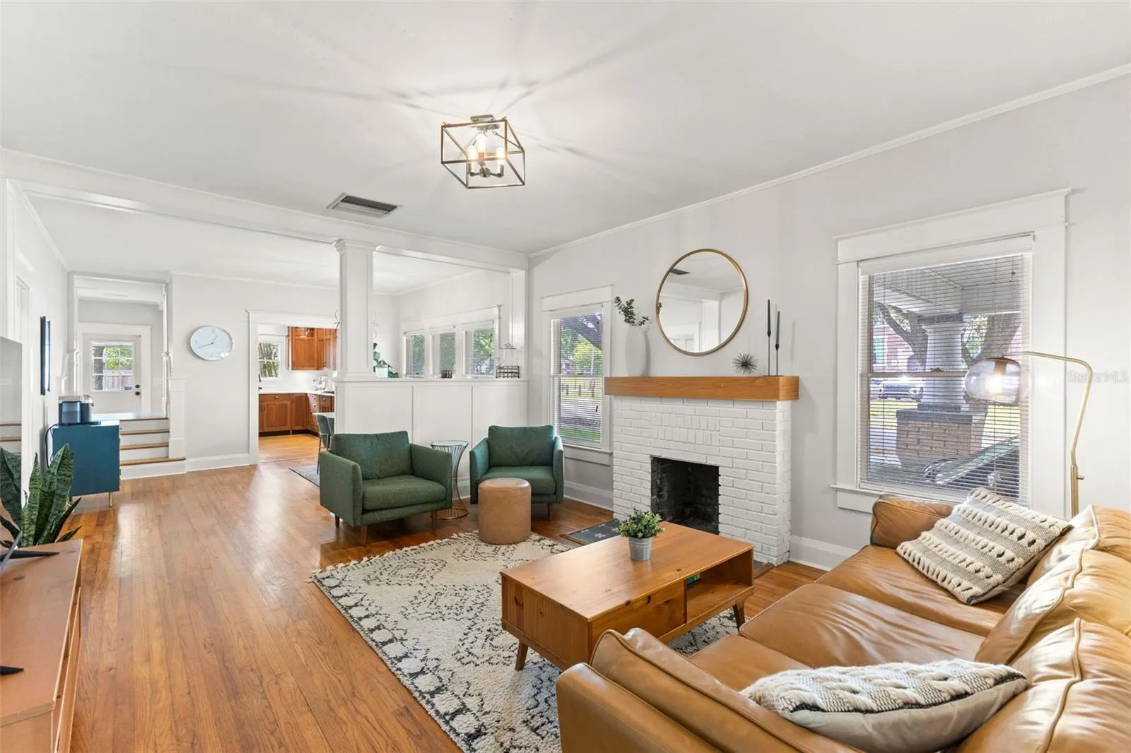 The main living spaces showcase the home’s original character, featuring rich hardwood flooring, soaring 10-foot ceilings, and custom built-ins that add both beauty and practicality. The living room is anchored by a striking brick fireplace, while an abundance of windows fills the space with natural light throughout the day.