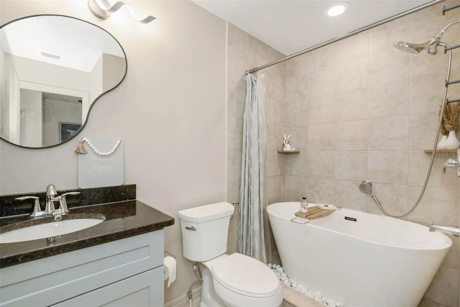 The primary suite offers a generous bedroom with a walk-in closet and a private en-suite bathroom complete with a soaking tub and separate shower. Two additional spacious bedrooms share a well-appointed full bathroom.
