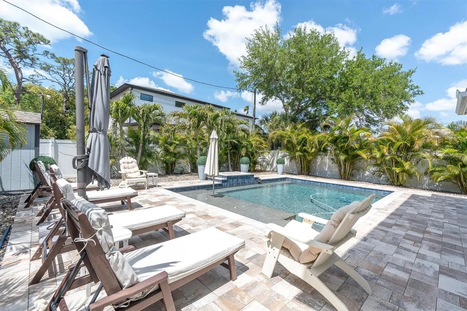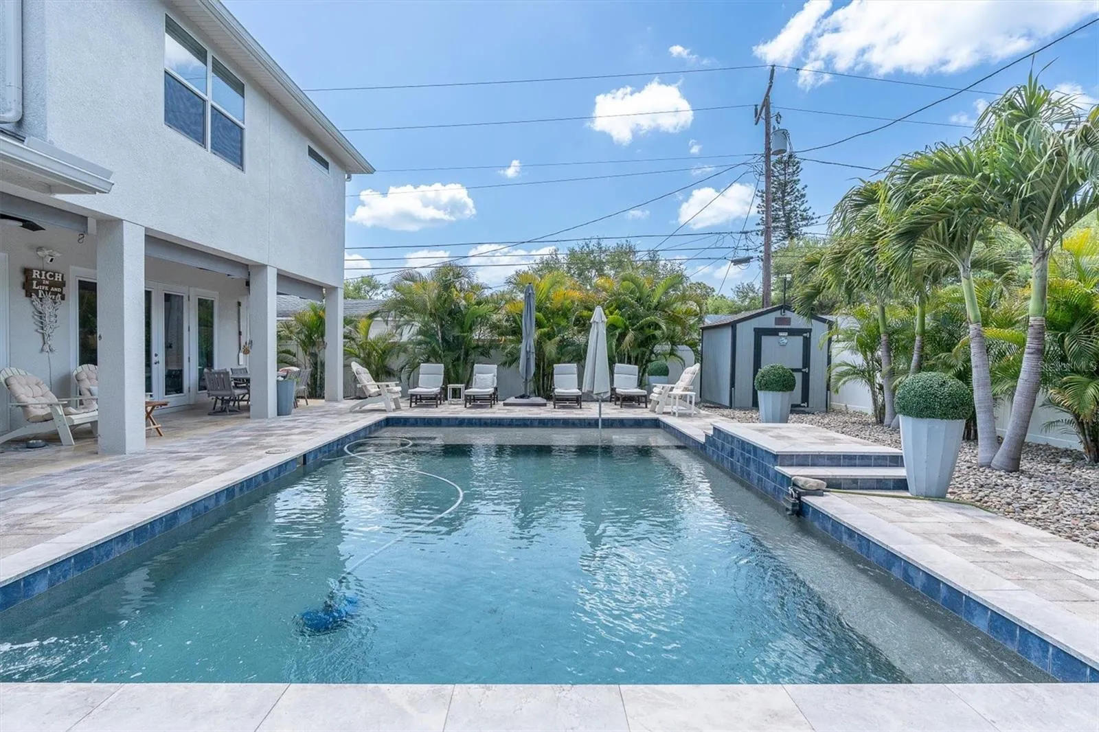 Exceptional quality and meticulous care defines this beautifully upgraded Eagle Crest residence, ideally situated on a quiet, tree-lined brick street in a Non-Flood zone (high and dry). Built by Apple Homes, this 2-story Pool home offers timeless design, thoughtful enhancements, and true pride of ownership throughout. The open-concept layout is complemented by tray ceilings, crown molding, maple wood flooring, and abundant natural light. Downstairs bedroom can be utilized as a den or office. The chef’s kitchen is well-appointed with custom maple cabinetry, oversized island with apron-front sink, wine refrigeration, pantry, and stainless appliance package—seamlessly connecting to the main living and dining spaces. The outdoor living experience is a true highlight. The private backyard has been enhanced with 15 recently installed palm trees, creating a lush, resort-style setting. Covered travertine lanai with dual ceiling fans overlooks the saltwater pool featuring a PebbleTec finish, sun shelf, waterfall, and color-changing lighting. Upstairs, the primary suite offers a refined retreat with tray ceiling, walk-in closet, and a spa-inspired bath including freestanding soaking tub and frameless glass shower. Secondary bedrooms are generously sized and offer flexibility for guests or home office use. Notable upgrades include a new shingle roof (2025), owned Tesla Solar System (7.2 kW) with dual Powerwalls providing whole-house backup power. Additional features include: impact windows, Kinetico whole-house water softener with carbon filtration, reverse osmosis system, smart and drip irrigation, dual Nest thermostats, custom blinds, paver driveway, and an outdoor Tuff Shed. Prime central location with convenient access to beaches, shopping, dining, downtown St. Petersburg, and major thoroughfares. Schedule your private tour to view this wonderful home today.