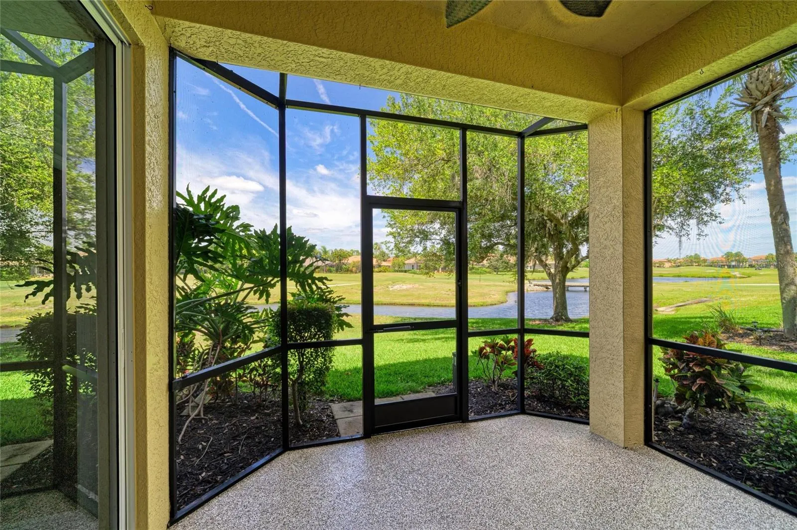 The main living area is light, airy, and beautifully updated, featuring a designer backsplash, under-cabinet lighting, granite countertops, and a generous breakfast bar—perfect for hosting or casual everyday living. Just beyond, a charming bonus space opens to the lanai through double sliders, while the living room’s expansive triple sliders seamlessly blend indoor and outdoor living. Step into the screened lanai to take in tranquil lake views and sweeping golf course vistas—your own private retreat. Sizeable laundry room for extra storage along with, front load washer & dryer.