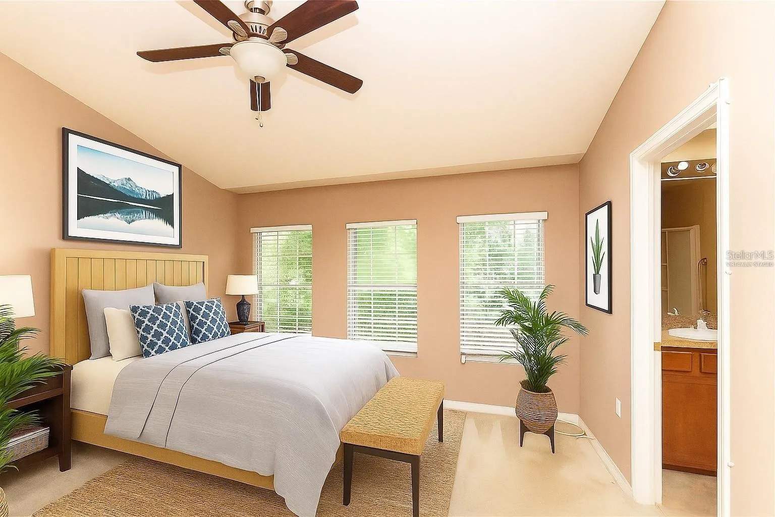 Upstairs, the expansive primary suite features vaulted ceilings, a dual-sink vanity, and a walk-in shower. Two additional generously sized bedrooms and a full bath complete the upper level.