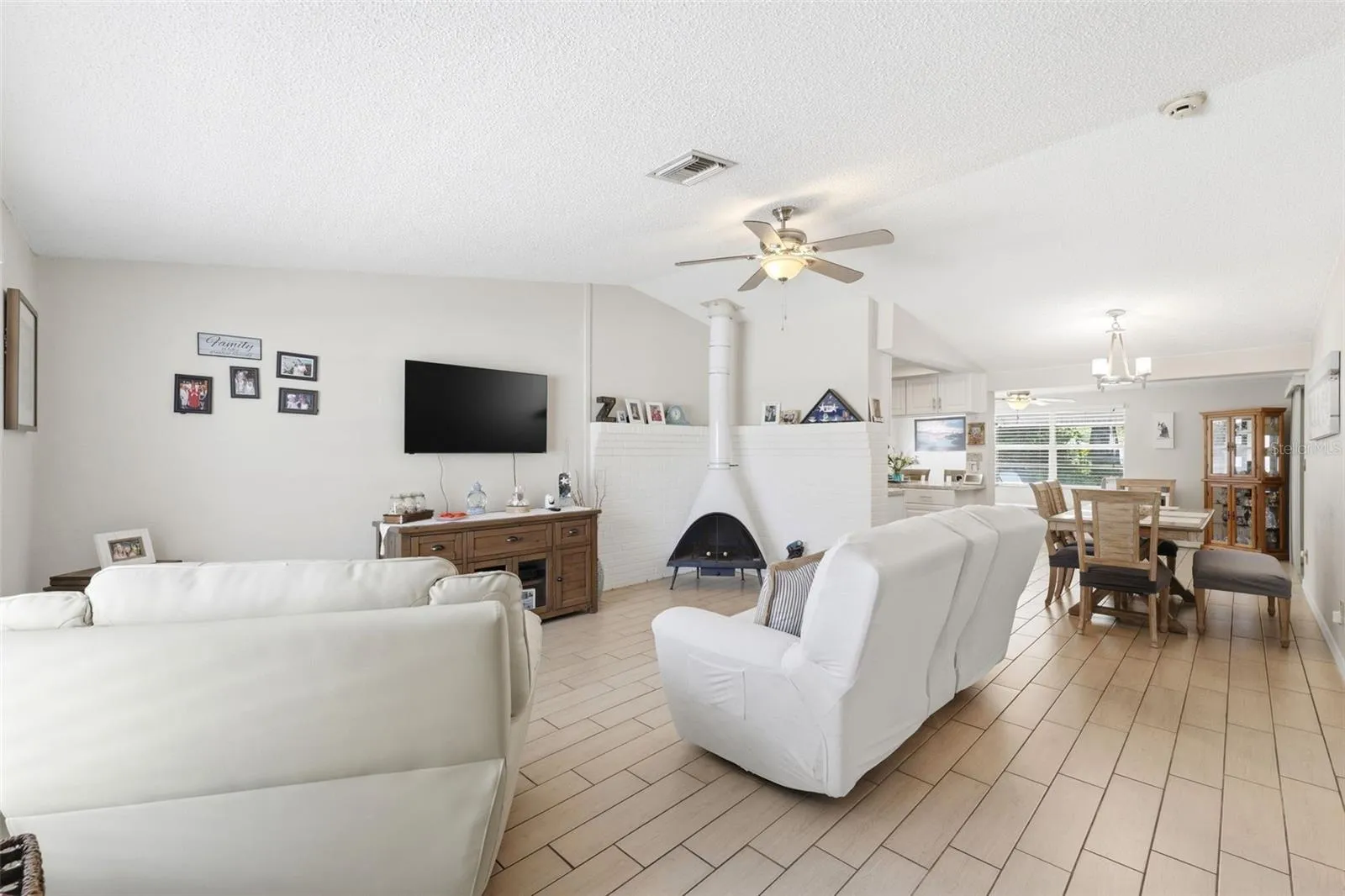 Featuring 3 spacious bedrooms and 2 full bathrooms, this well-maintained residence is designed for easy living. Step inside to a bright and inviting living area centered around a cozy wood-burning fireplace—perfect for relaxing evenings or entertaining guests. The layout flows seamlessly into the dining and kitchen areas, creating a practical space for everyday life.